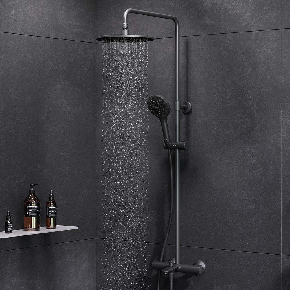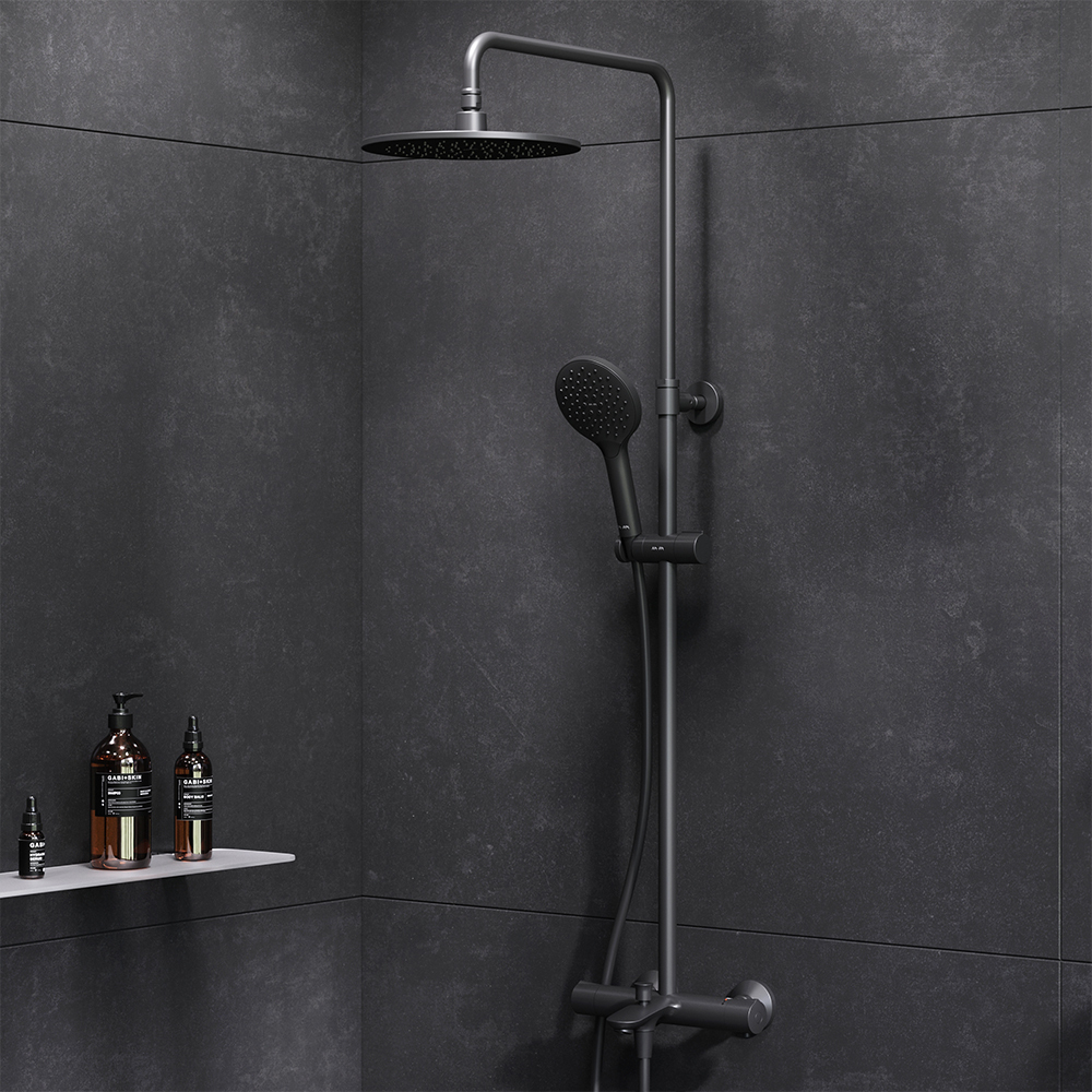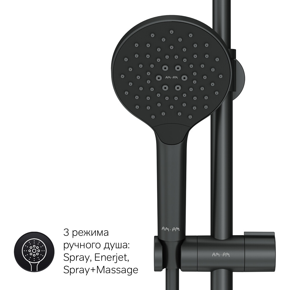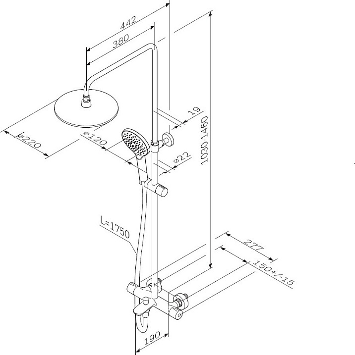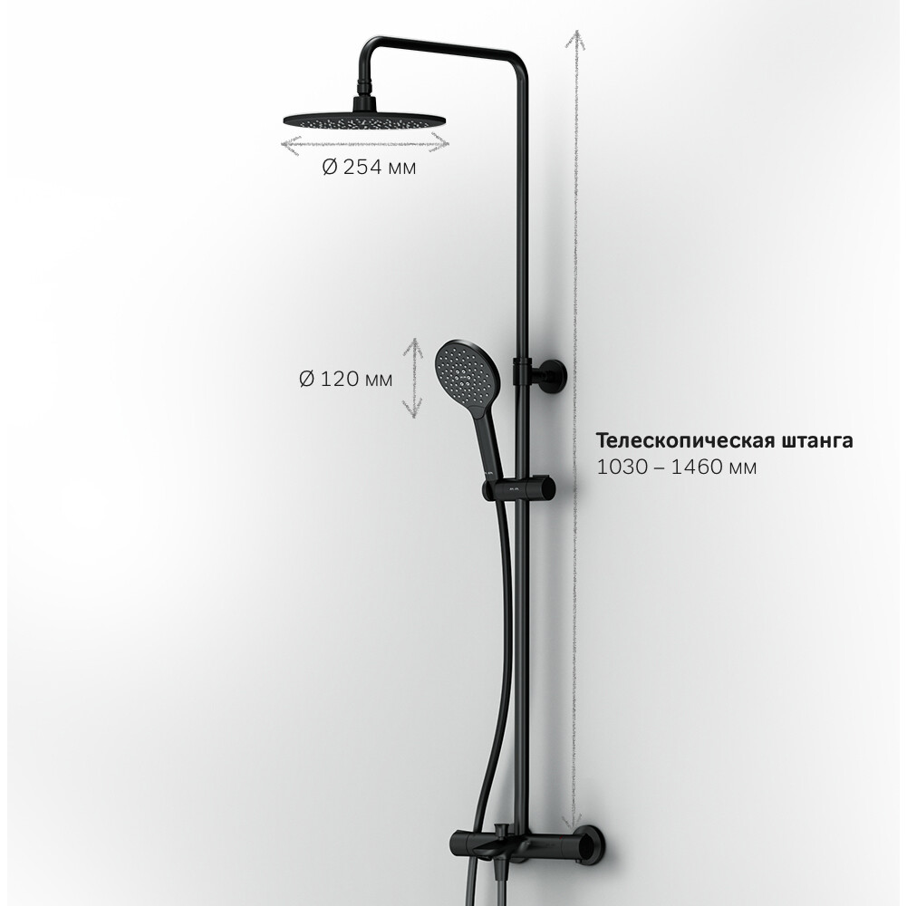 Продуманные детали для удобства использования: штанга регулируется по высоте в диапазоне от 1030 до 1460 мм, обеспечивая комфорт для людей любого роста, шаровый шарнир в держателе верхнего душа позволяет регулировать угол его наклона, душевой шланг 1750 мм, верхний душ диаметром 220 мм, ручной душ диаметром 120 мм.