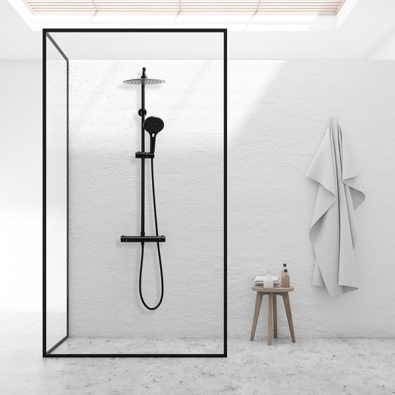 В комплект входит термостатический смеситель для душа со смесителем температуры, регулировкой и переключателем потока воды между тропическим душем и трубкой. Смеситель с функцией точной настройки температуры гарантирует высокий комфорт и безопасность пользования душем. Керамическая головка батареи (35 мм) гарантирует долговечность и прочность. В комплект входит стильный тропический душ типа SLIM диаметром 25 см и матовая черная насадка для душа – оба с современной системой ANTI-CALC. Насадка для душа оснащена двумя режимами струи воды, которые можно переключать нажатием кнопки на ручке. Дизайн набора соответствует последним тенденциям – он выглядит очень элегантно и прекрасно вписывается в современную ванную комнату.