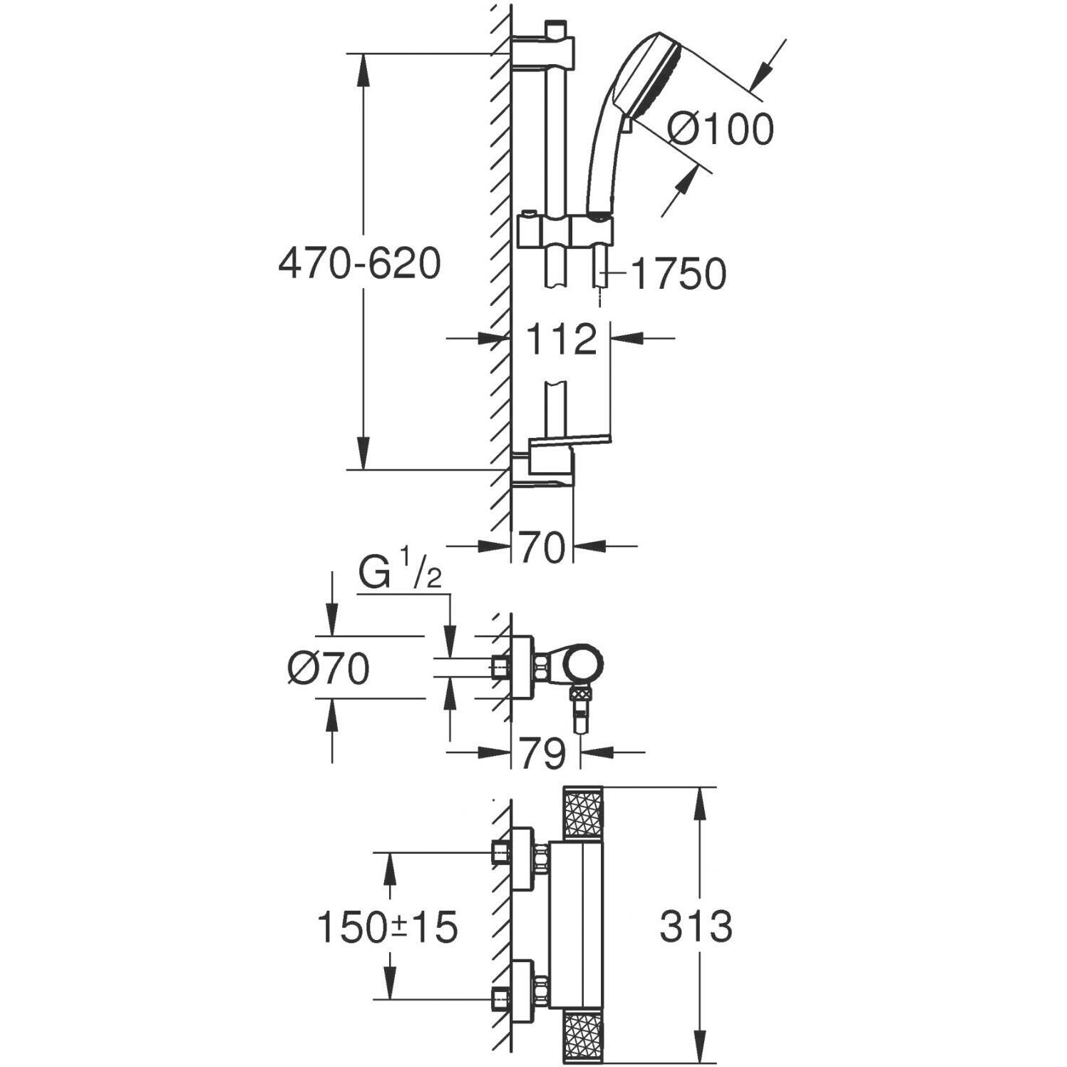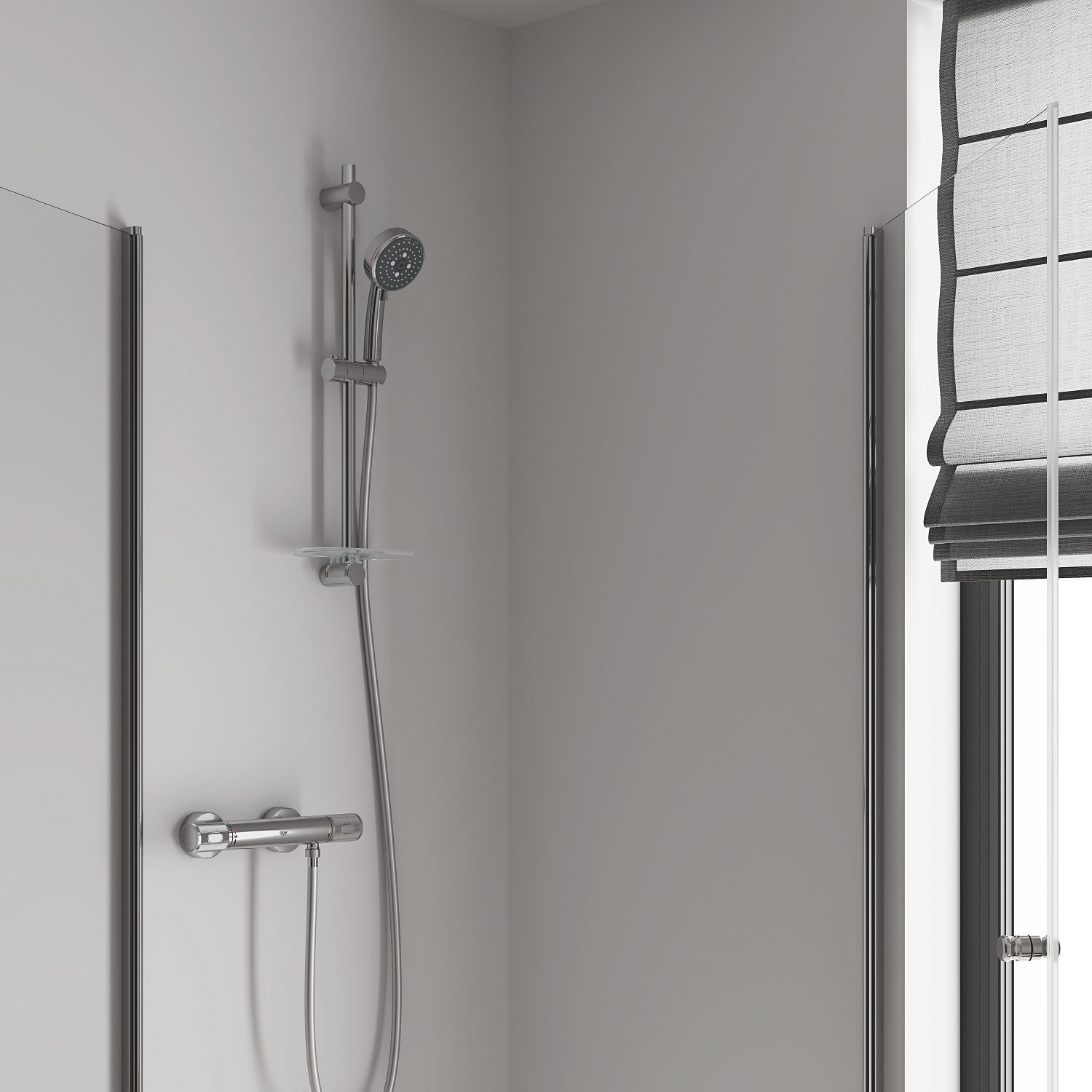 Душевый набор GROHE QuickFix Precision Feel Thermostatic не только идеально смотрится для современной минималистичной ванной комнаты, но и поражает характеристиками и производительностью, подходящими для насыщенной семейной жизни. Воспользуйтесь преимуществами термостатического смесителя с помощью этого настенного комплекта. Его тонкий цилиндрический силуэт скрывает функции, обеспечивающие повышенное удобство. Всегда легкое управление даже мокрыми или мыльными руками – эргономичные ручки GROHE ProGrip имеют рифленую поверхность для удобного сцепления. В нем есть все необходимое, включая душевой набор GROHE Vitalio Comfort 100, состоящий из ручного душа с тремя режимами – мягким режимом Rain, наполненным воздухом режимом Rain O2 и мощным Massage. Душевые штанга 600 мм и шланг 1750 мм также входят в набор. Технология GROHE TurboStat позволяет наслаждаться водой, всегда имеющей идеальную температуру без колебаний. Безопасность входит в стандартную комплектацию, что делает его идеальным выбором для семейных ванных комнат. Дети не могут поднять температуру слишком высоко благодаря кнопке блокировки GROHE SafeStop, установленной на 38°C, и ограничителю температуры GROHE SafeStop Plus, который можно установить на дополнительный предел 43°C. GROHE CoolTouch гарантирует, что корпус смесителя никогда не нагревается на ощупь благодаря внутреннему каналу охлаждения. Смеситель имеет функцию экономии воды с функцией GROHE EcoJoy, что уменьшает поток воды. Нужна полная мощность? Просто нажмите кнопку EcoButton, чтобы высвободить рычаг. Этот шикарный смеситель украшен прочным покрытием GROHE StarLight для долгосрочного блестящего вида. Технология GROHE DreamSpray обеспечивает равномерный поток воды из каждой душевой форсунки, а форсунки легко очищаются от известкового налета благодаря функции SpeedClean. Шампуни можно удобно хранить под рукой благодаря встроенному лотку EasyReach.