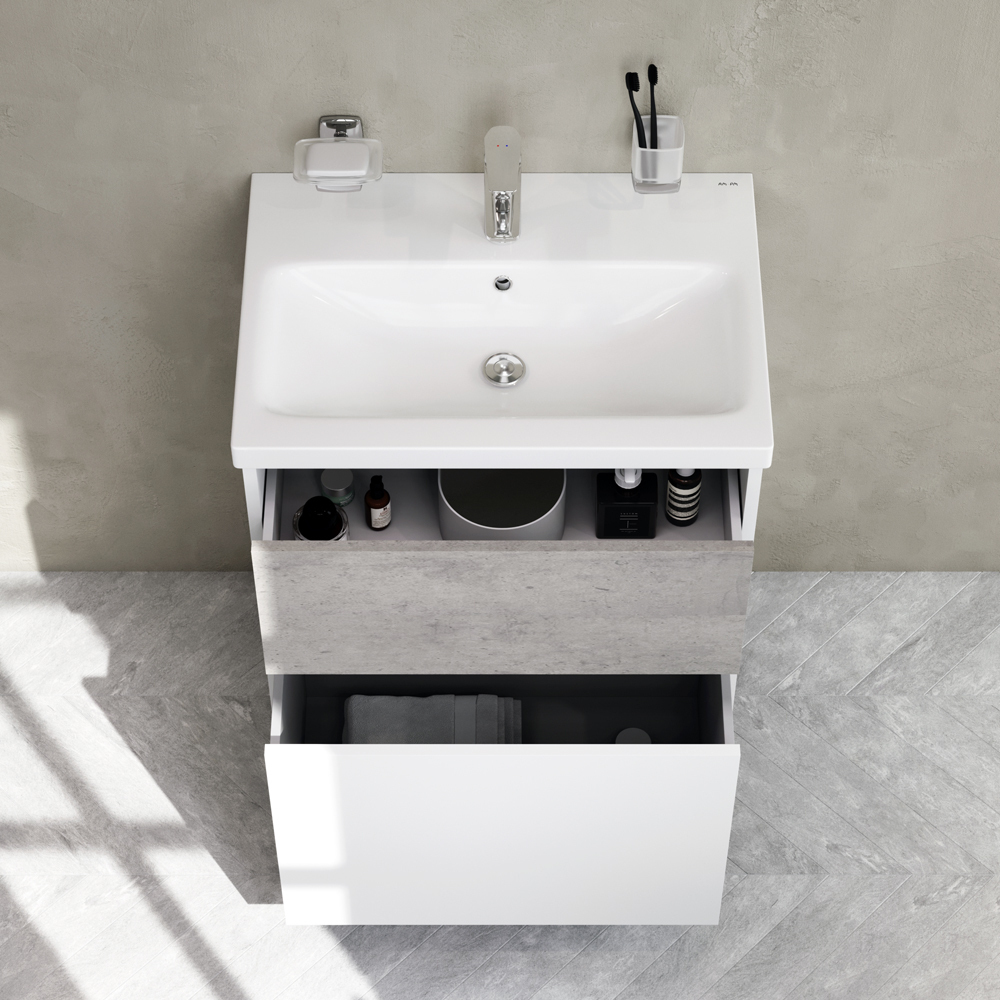 Мебель AM.PM GEM S - современный европейский дизайн в стиле минимализм. Комплект мебели оснащен самой компактной и функциональной раковиной на рынке: проекция всего 42 см при максимальной глубине чаши! Трендовое сочетание цветов: белый глянец и светлое дерево.