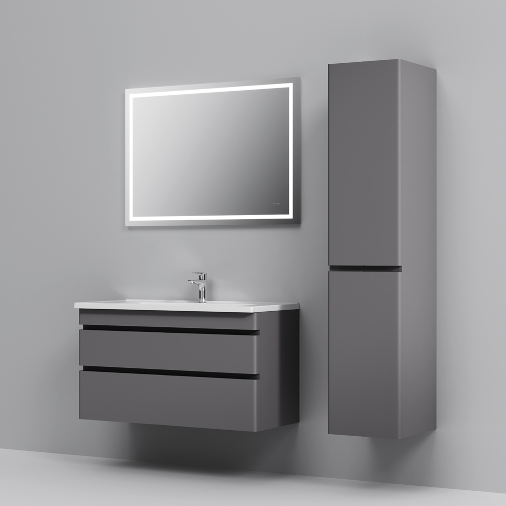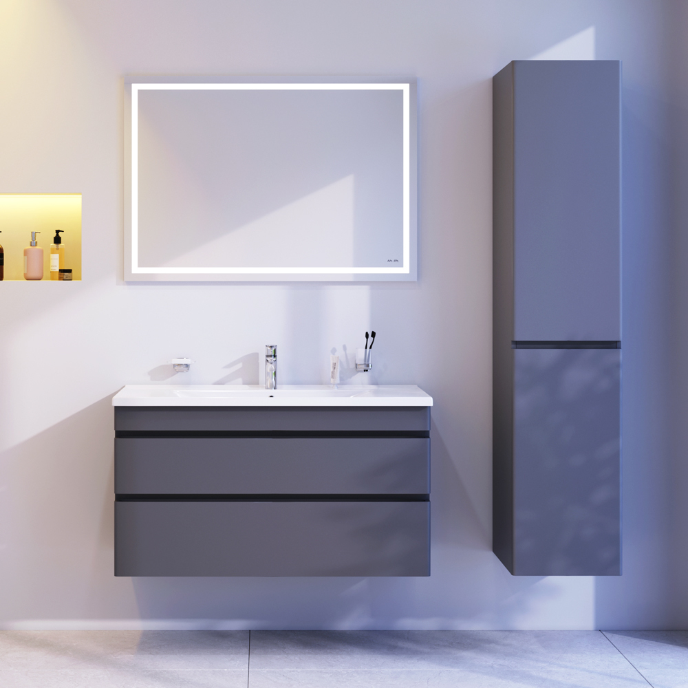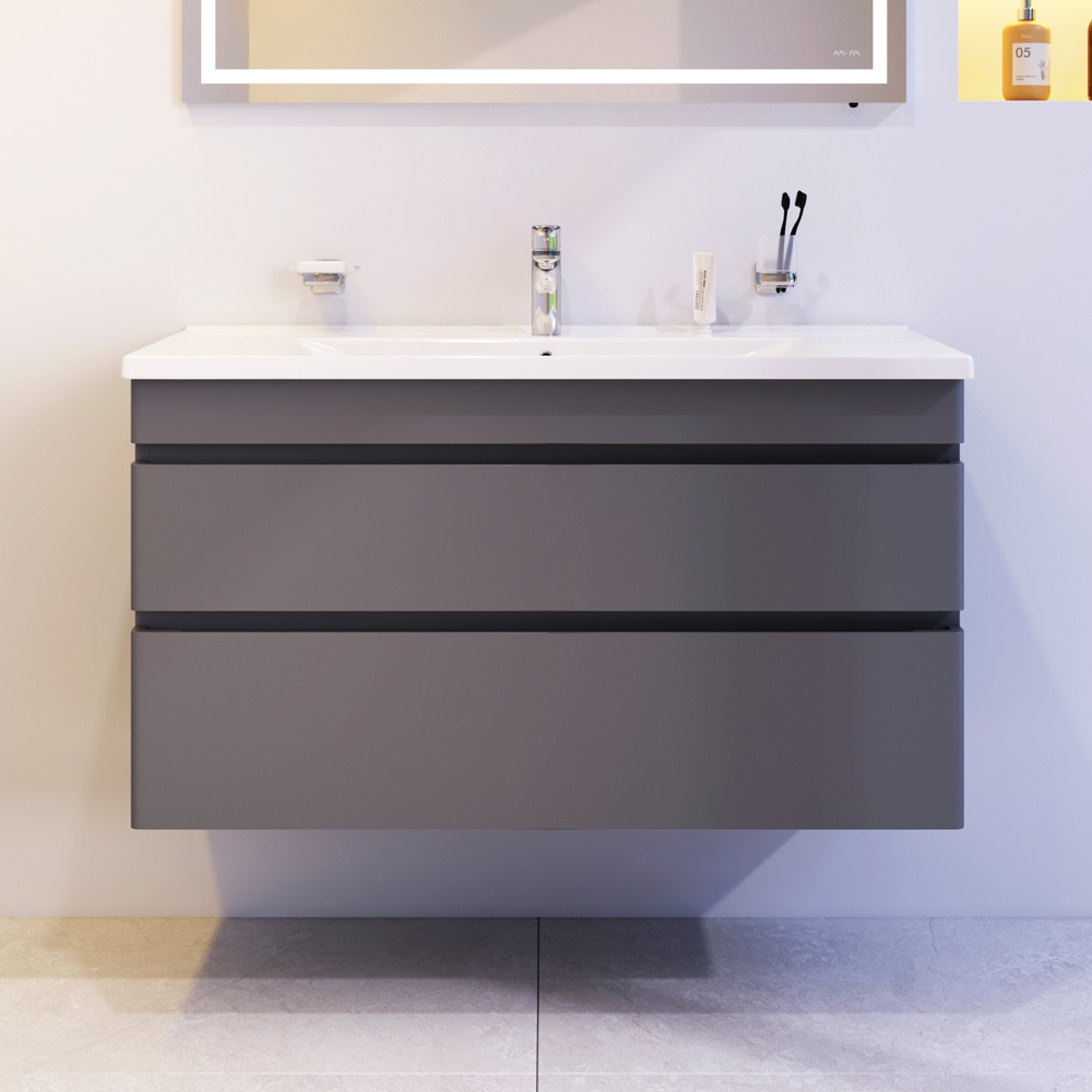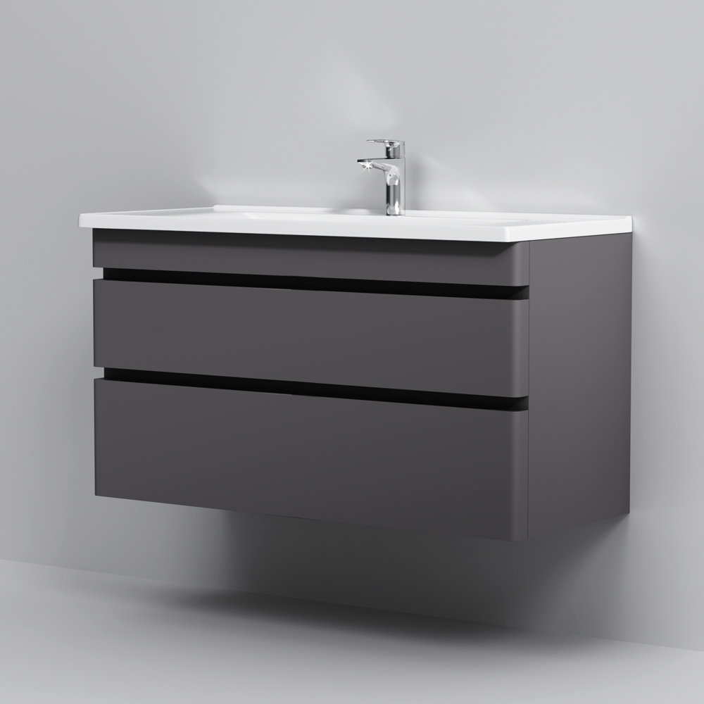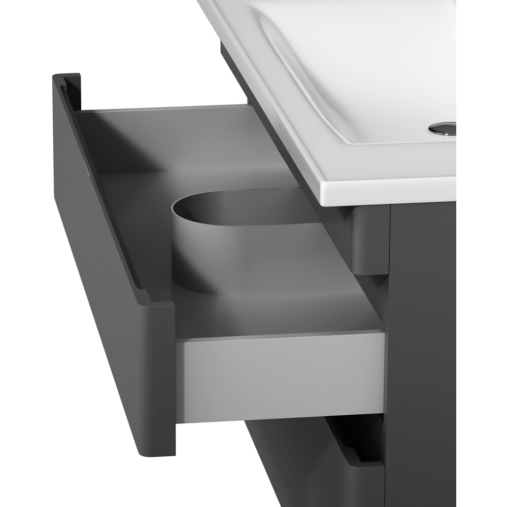 Новинка мебели для ванной Hit. Фасады в цвете графит покрыты экологически чистыми и долговечными полиакриловыми эмалями, которые наносятся по специальной технологии покраски в 7 слоев. Это обеспечивает насыщенный цвет в течение всего срока службы (от 10 лет). Мягкое открытие и закрытие ящиков обеспечивают направляющие скрытого монтажа с системой мягкого закрывания soft close. Тумба комплектуется раковиной из стекловидного фарфора, самого гигиеничного и влагостойкого материала. Это самая компактная и функциональная раковина на рынке: проекция всего 42 см при максимальной глубине чаши!