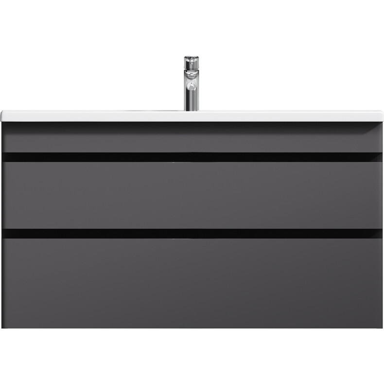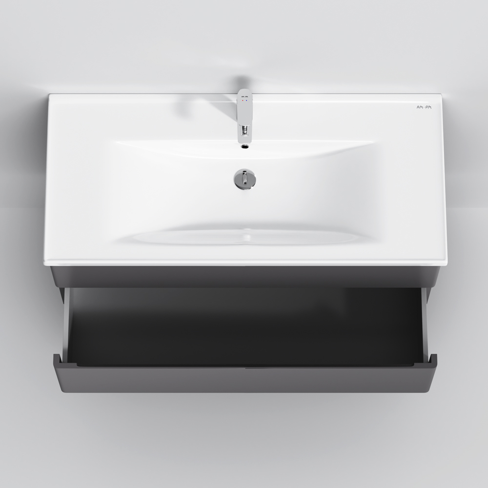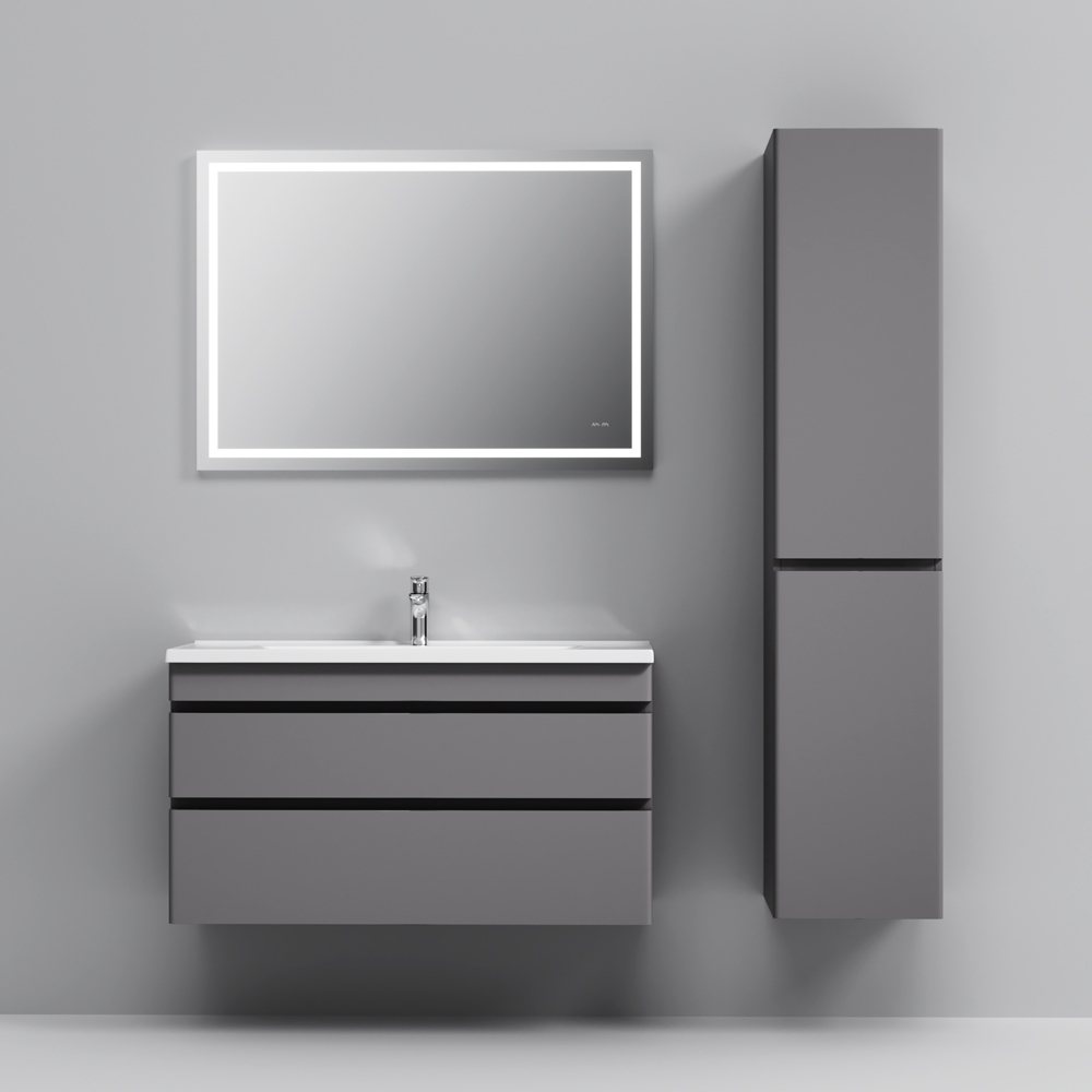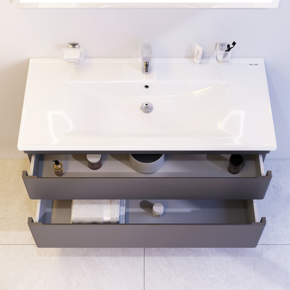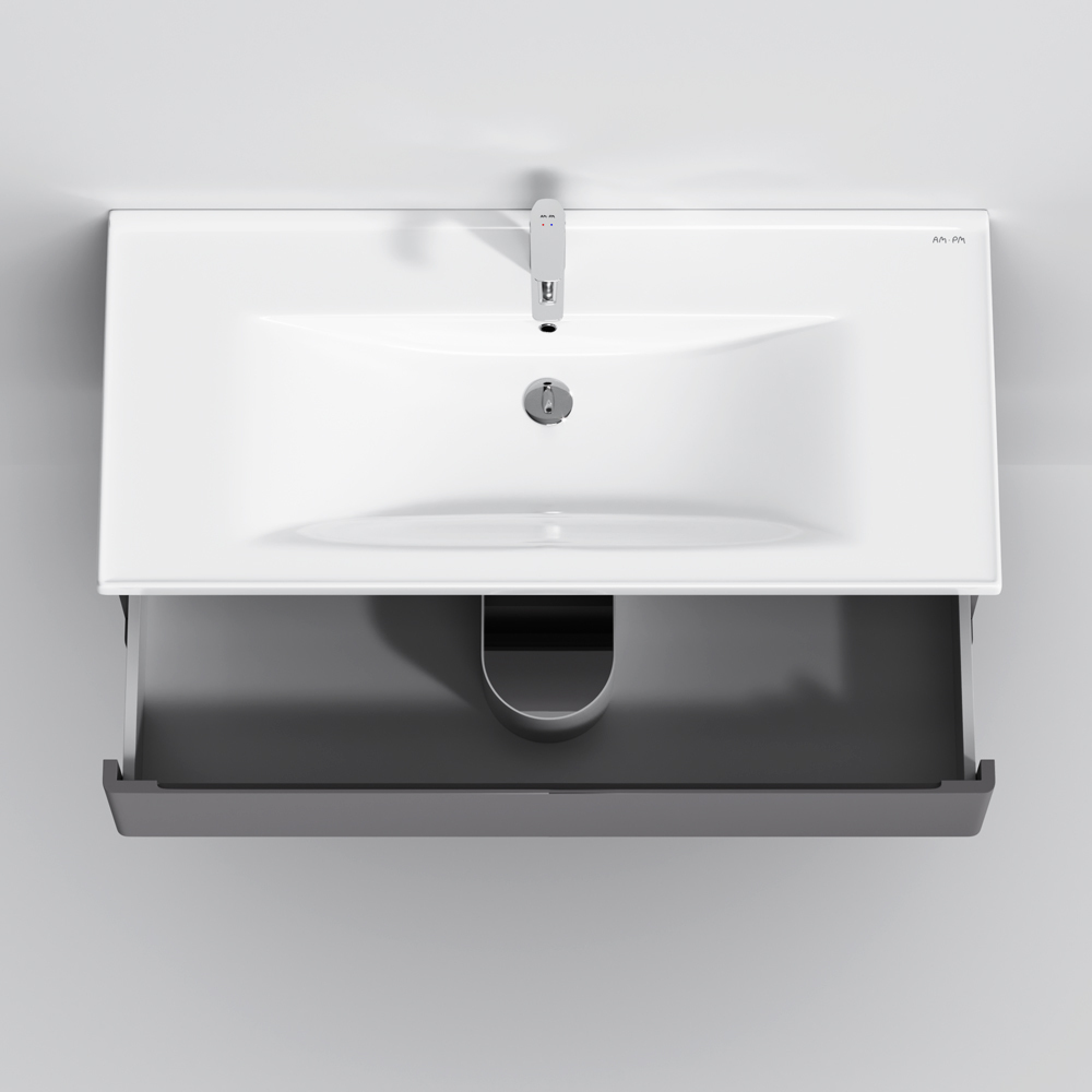 Новинка мебели для ванной Hit. Фасады в цвете графит покрыты экологически чистыми и долговечными полиакриловыми эмалями, которые наносятся по специальной технологии покраски в 7 слоев. Это обеспечивает насыщенный цвет в течение всего срока службы (от 10 лет). Мягкое открытие и закрытие ящиков обеспечивают направляющие скрытого монтажа с системой мягкого закрывания soft close. Тумба комплектуется раковиной из стекловидного фарфора, самого гигиеничного и влагостойкого материала. Это самая компактная и функциональная раковина на рынке: проекция всего 42 см при максимальной глубине чаши!