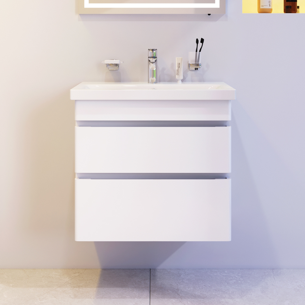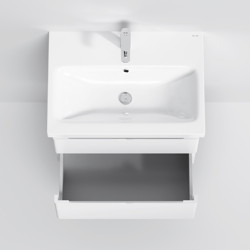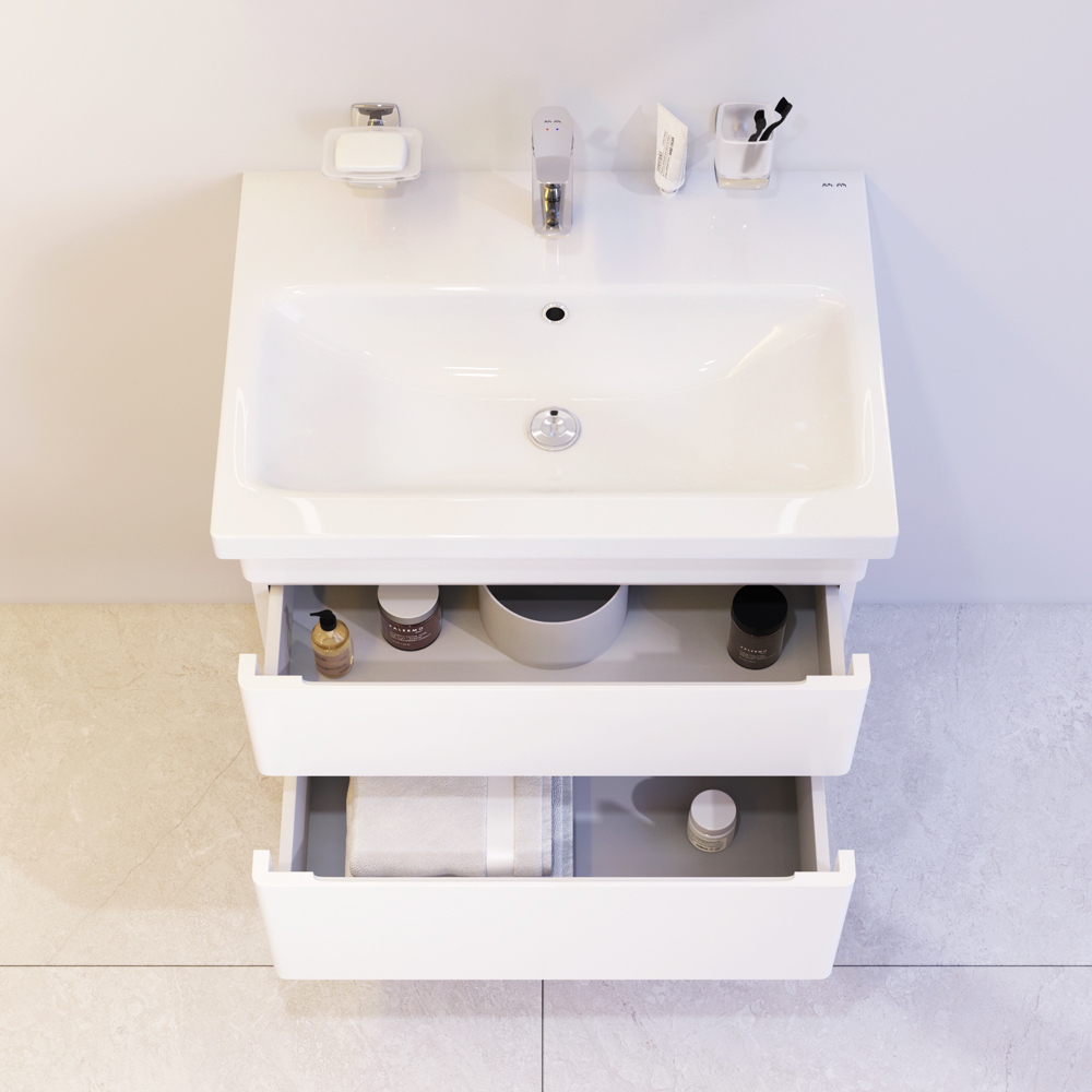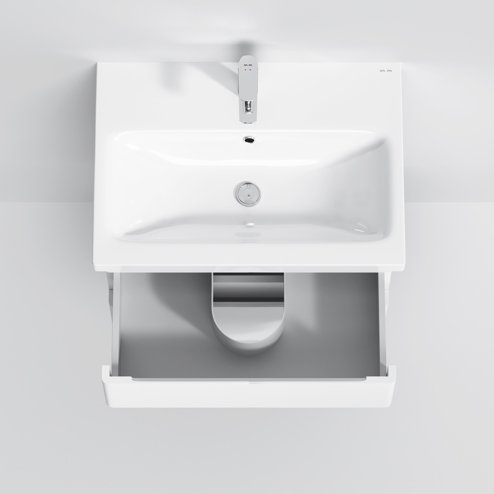 Новинка мебели для ванной Hit. Белые глянцевые фасады покрыты экологически чистыми и долговечными полиакриловыми эмалями, которые наносятся по специальной технологии покраски в 7 слоев. Это обеспечивает насыщенный цвет в течение всего срока службы (от 10 лет). Мягкое открытие и закрытие ящиков обеспечивают направляющие скрытого монтажа с системой мягкого закрывания soft close. Тумба комплектуется раковиной из стекловидного фарфора, самого гигиеничного и влагостойкого материала. Это самая компактная и функциональная раковина на рынке: проекция всего 42 см при максимальной глубине чаши!
