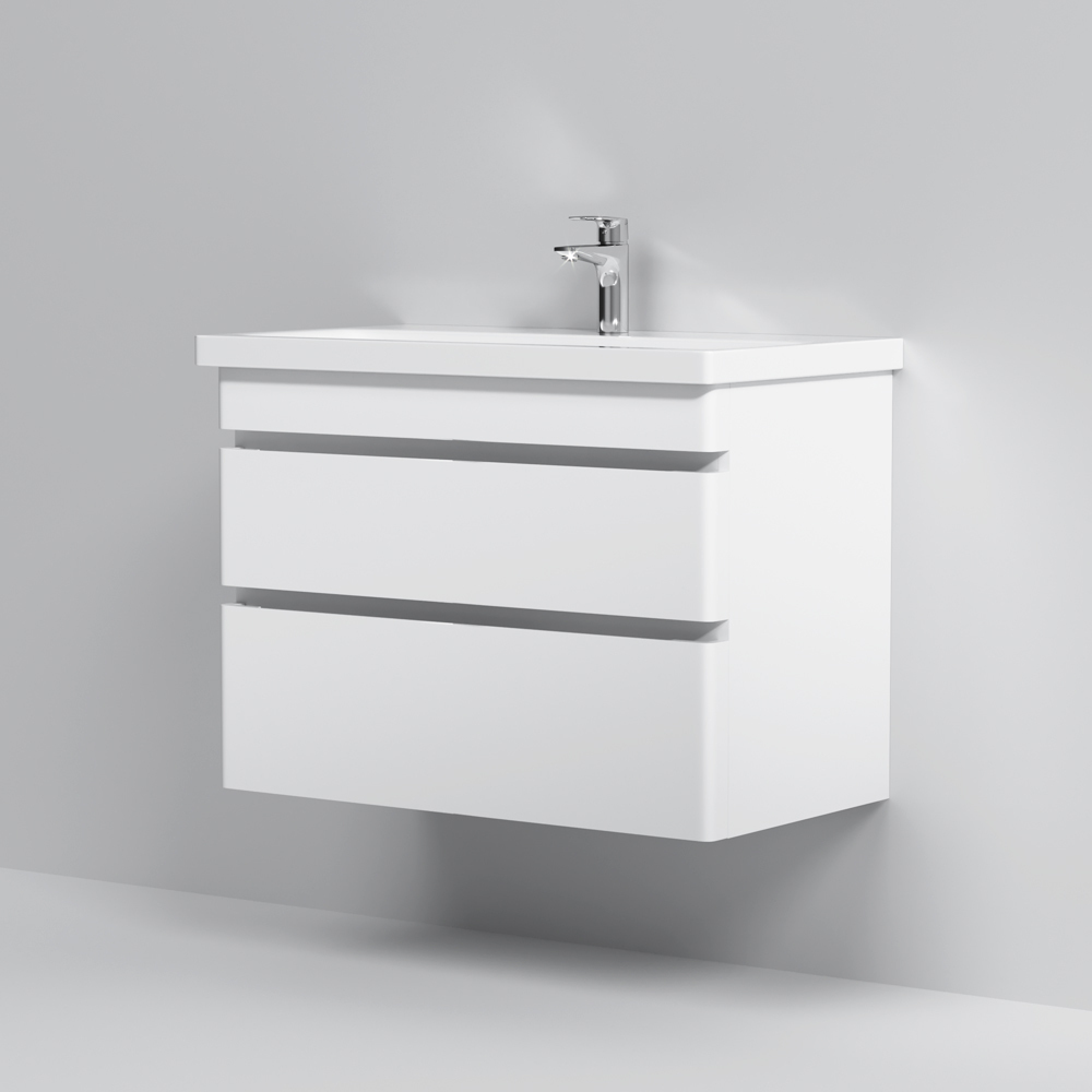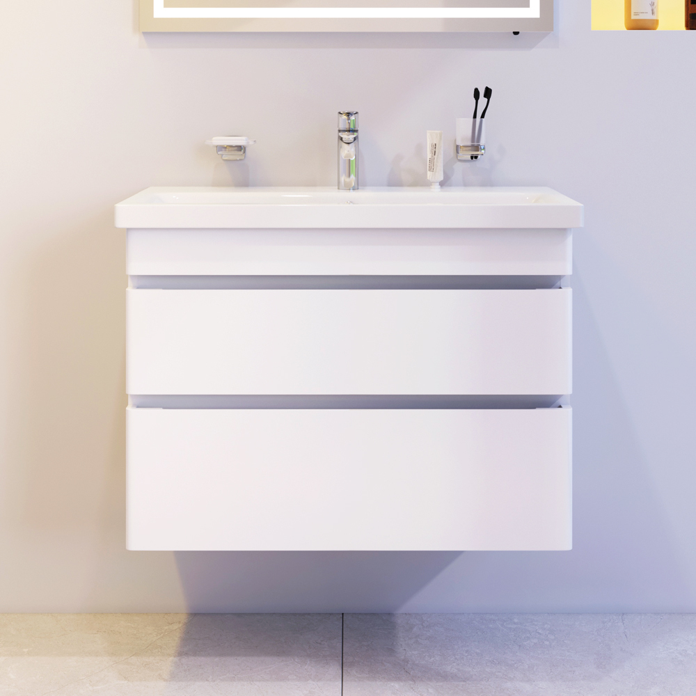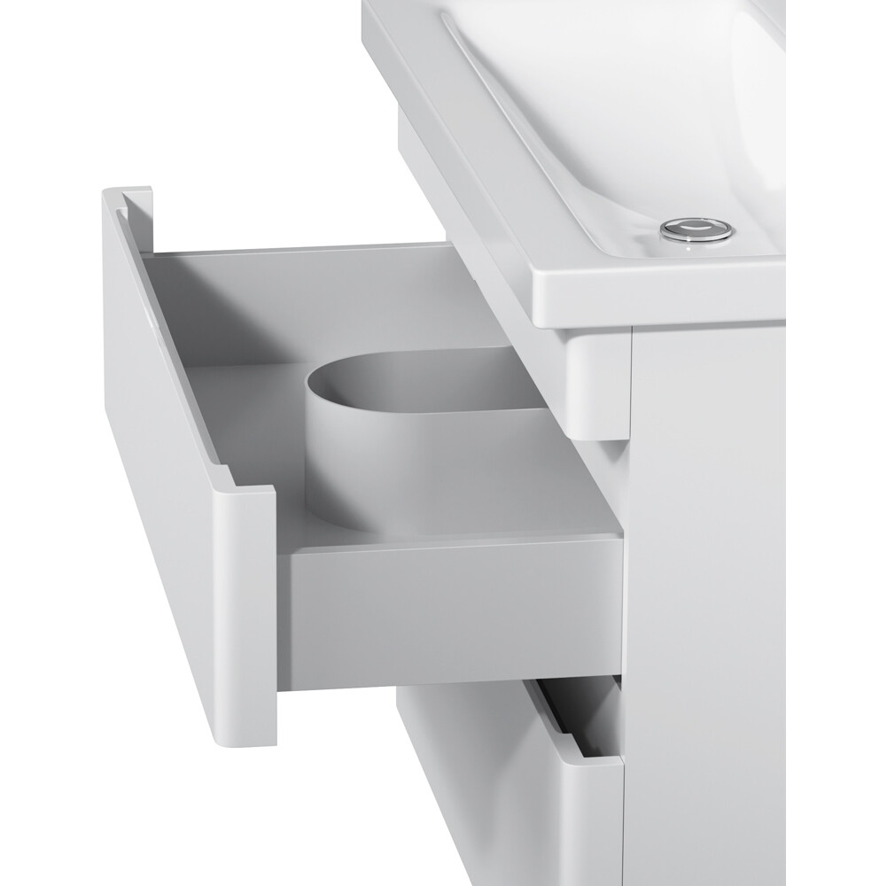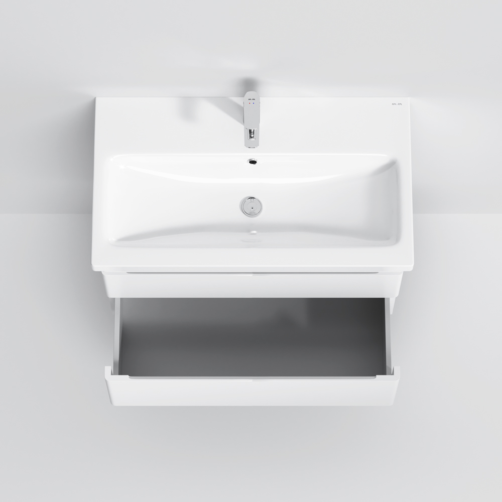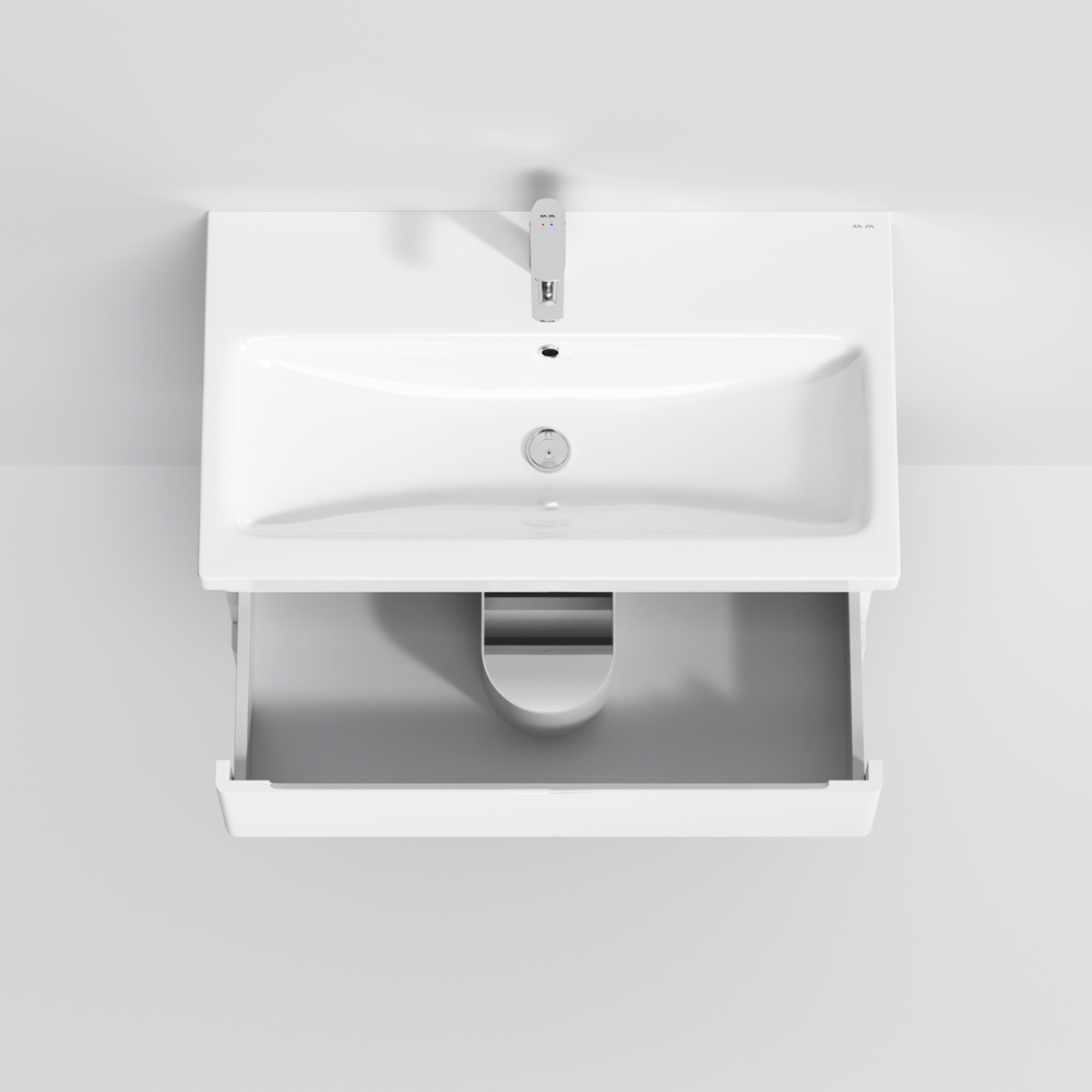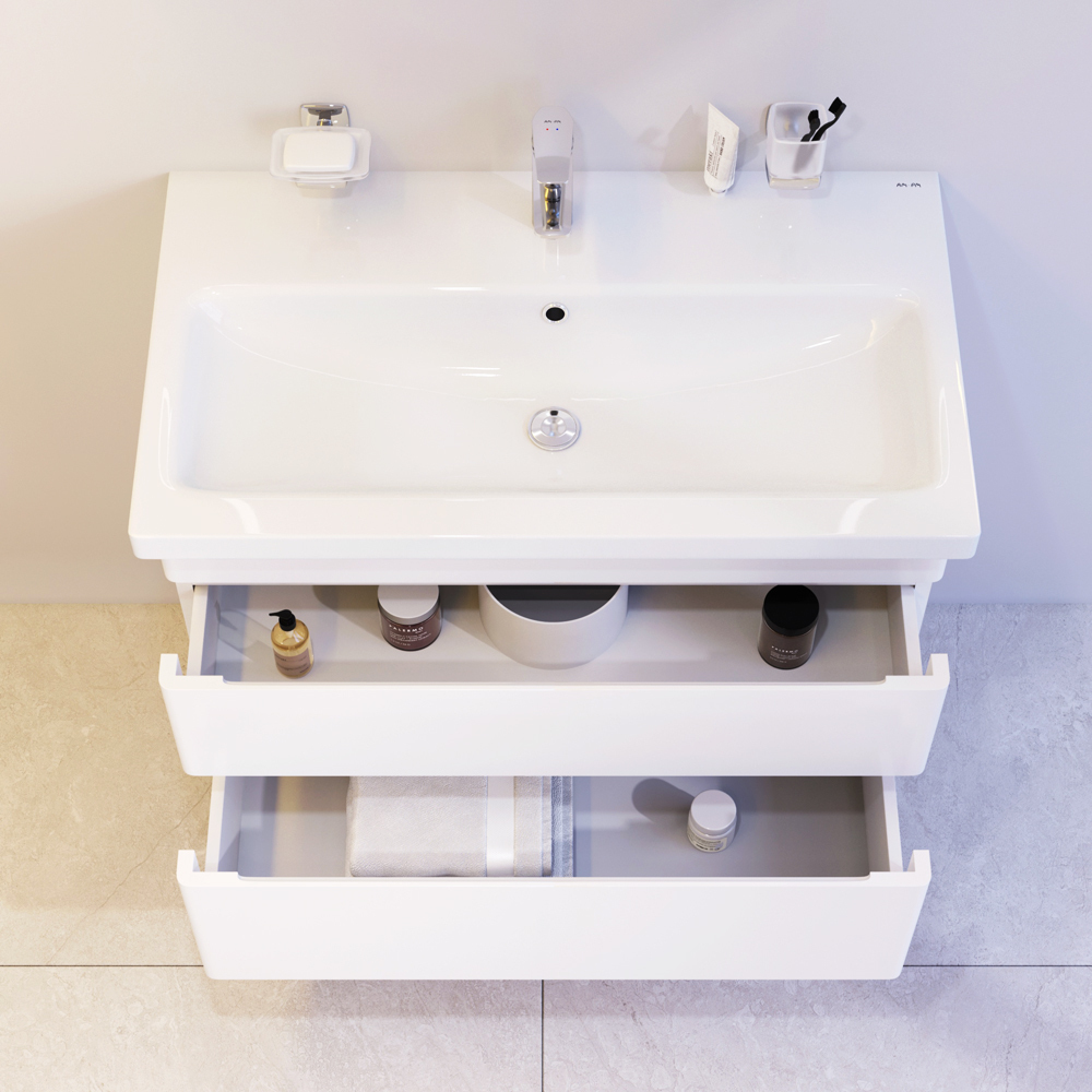 Новинка мебели для ванной Hit. Белые глянцевые фасады покрыты экологически чистыми и долговечными полиакриловыми эмалями, которые наносятся по специальной технологии покраски в 7 слоев. Это обеспечивает насыщенный цвет в течение всего срока службы (от 10 лет). Мягкое открытие и закрытие ящиков обеспечивают направляющие скрытого монтажа с системой мягкого закрывания soft close. Тумба комплектуется раковиной из стекловидного фарфора, самого гигиеничного и влагостойкого материала. Это самая компактная и функциональная раковина на рынке: проекция всего 42 см при максимальной глубине чаши!