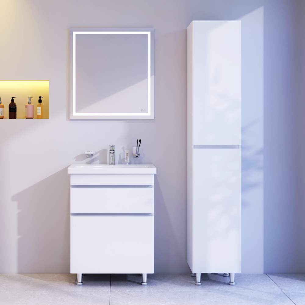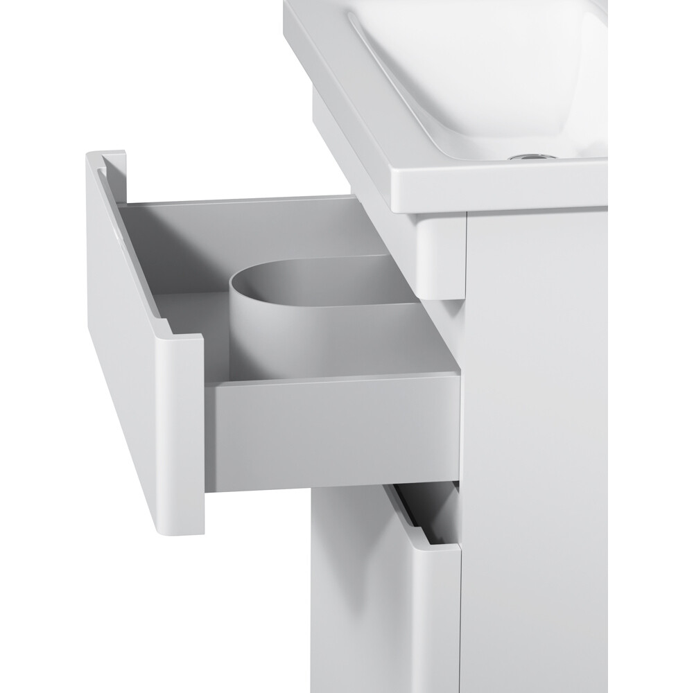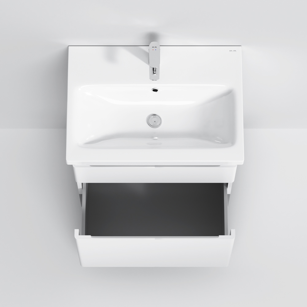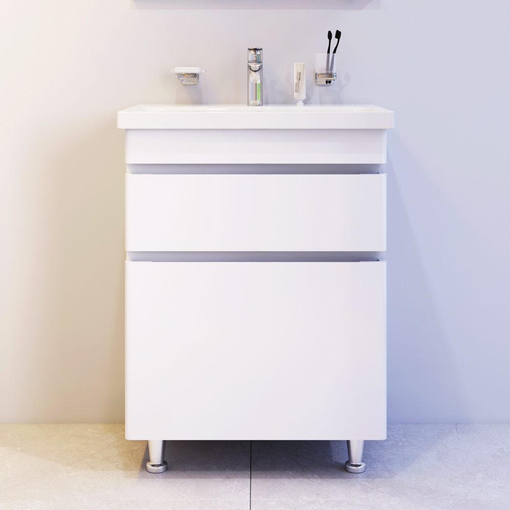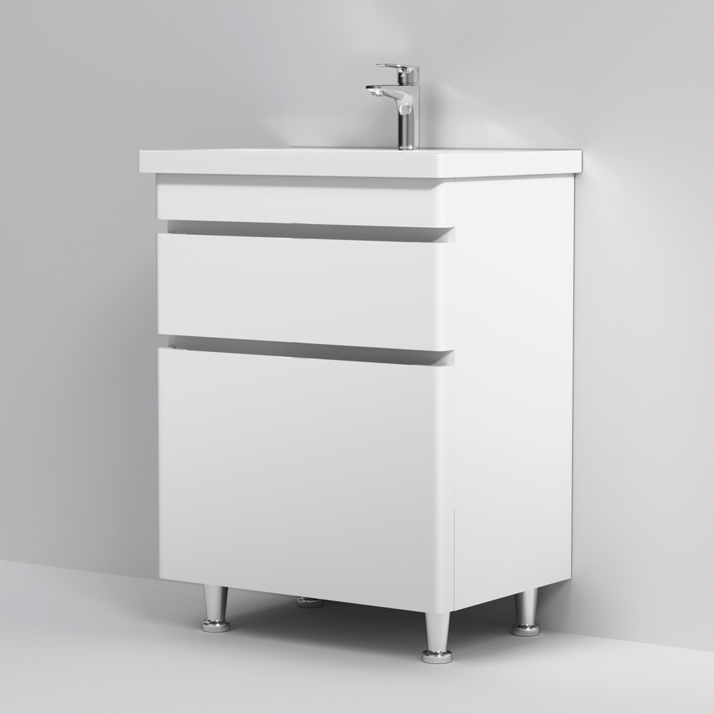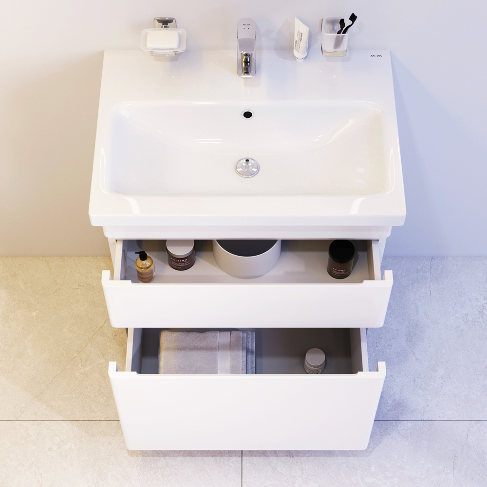 Новинка мебели для ванной Hit. Белые глянцевые фасады покрыты экологически чистыми и долговечными полиакриловыми эмалями, которые наносятся по специальной технологии покраски в 7 слоев. Это обеспечивает насыщенный цвет в течение всего срока службы (от 10 лет). Мягкое открытие и закрытие ящиков обеспечивают направляющие скрытого монтажа с системой мягкого закрывания soft close. Тумба комплектуется раковиной из стекловидного фарфора, самого гигиеничного и влагостойкого материала. Это самая компактная и функциональная раковина на рынке: проекция всего 43 см при максимальной глубине чаши!