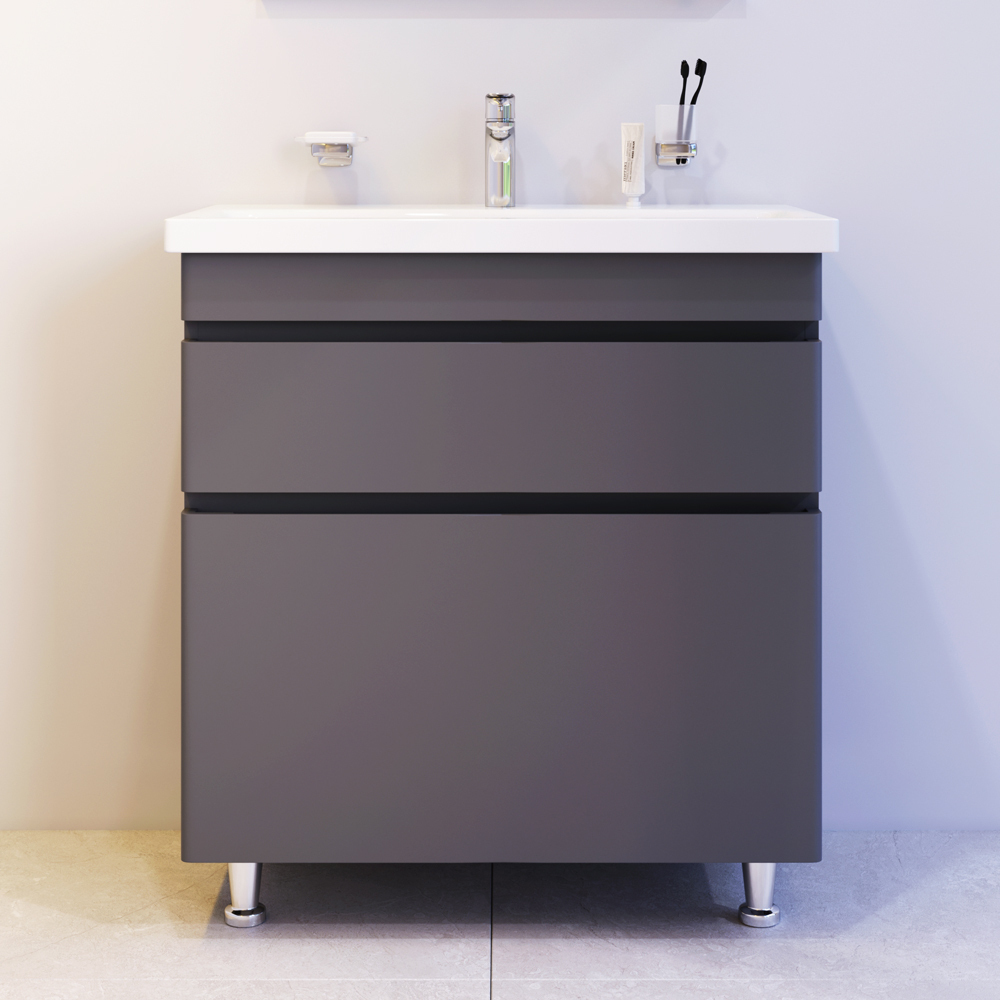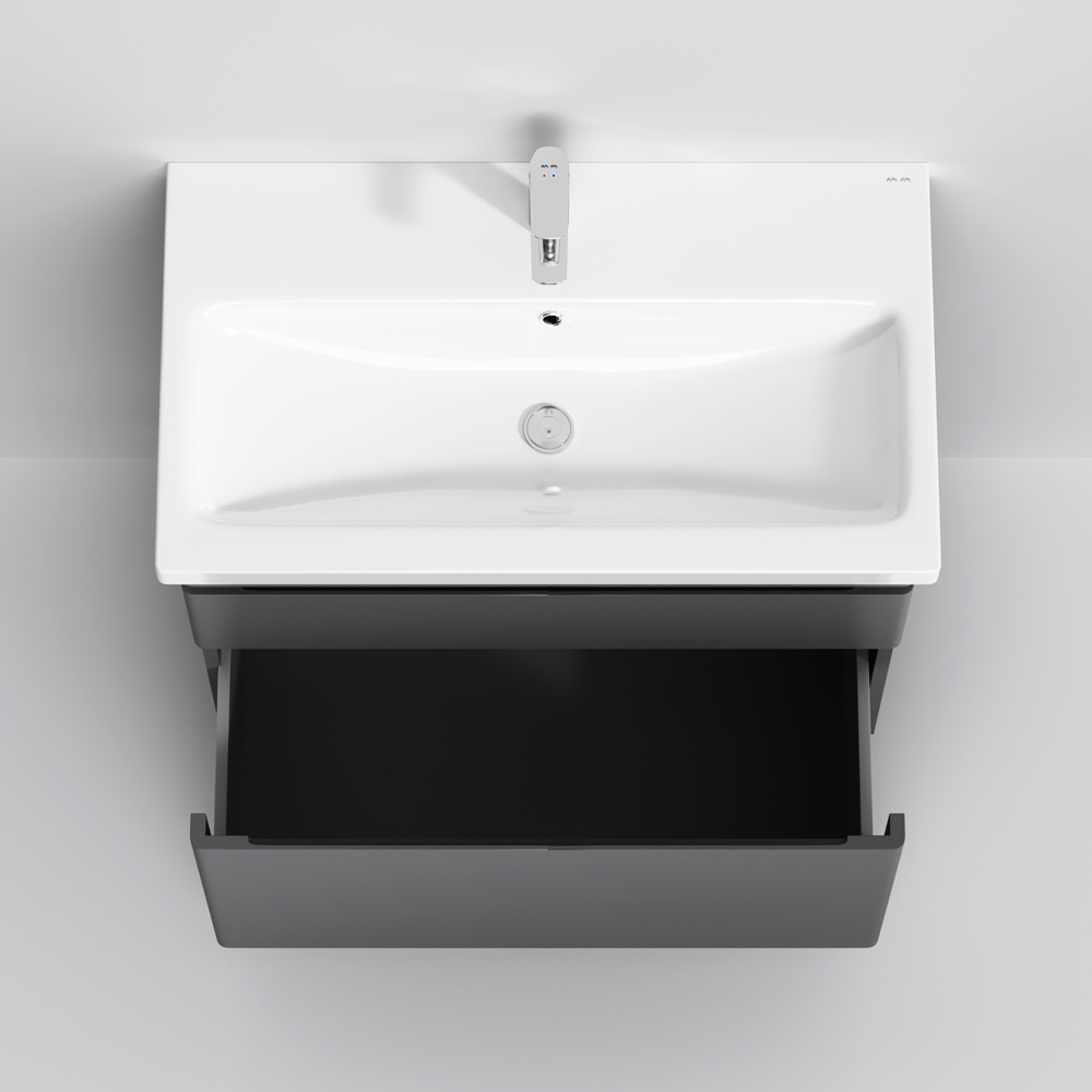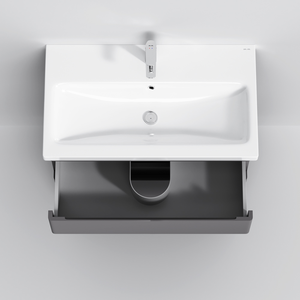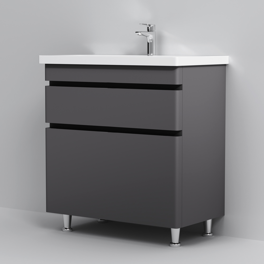 Новинка мебели для ванной Hit. Фасады в цвете графит покрыты экологически чистыми и долговечными полиакриловыми эмалями, которые наносятся по специальной технологии покраски в 7 слоев. Это обеспечивает насыщенный цвет в течение всего срока службы (от 10 лет). Мягкое открытие и закрытие ящиков обеспечивают направляющие скрытого монтажа с системой мягкого закрывания soft close. Тумба комплектуется раковиной из стекловидного фарфора, самого гигиеничного и влагостойкого материала. Это самая компактная и функциональная раковина на рынке: проекция всего 42 см при максимальной глубине чаши!