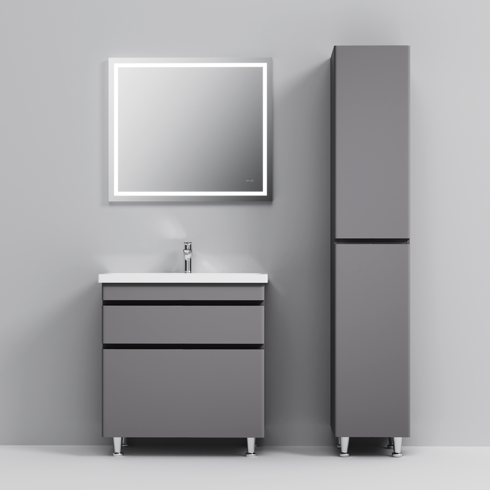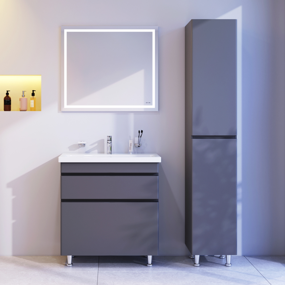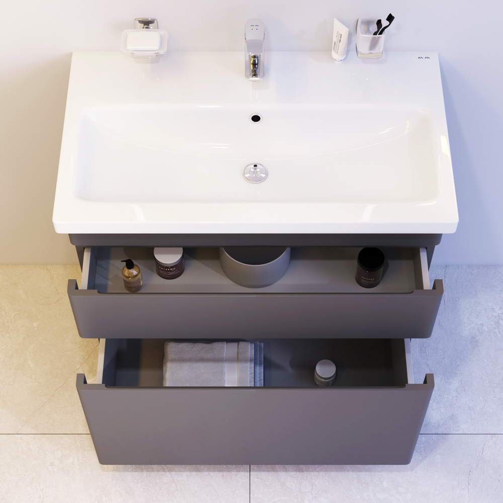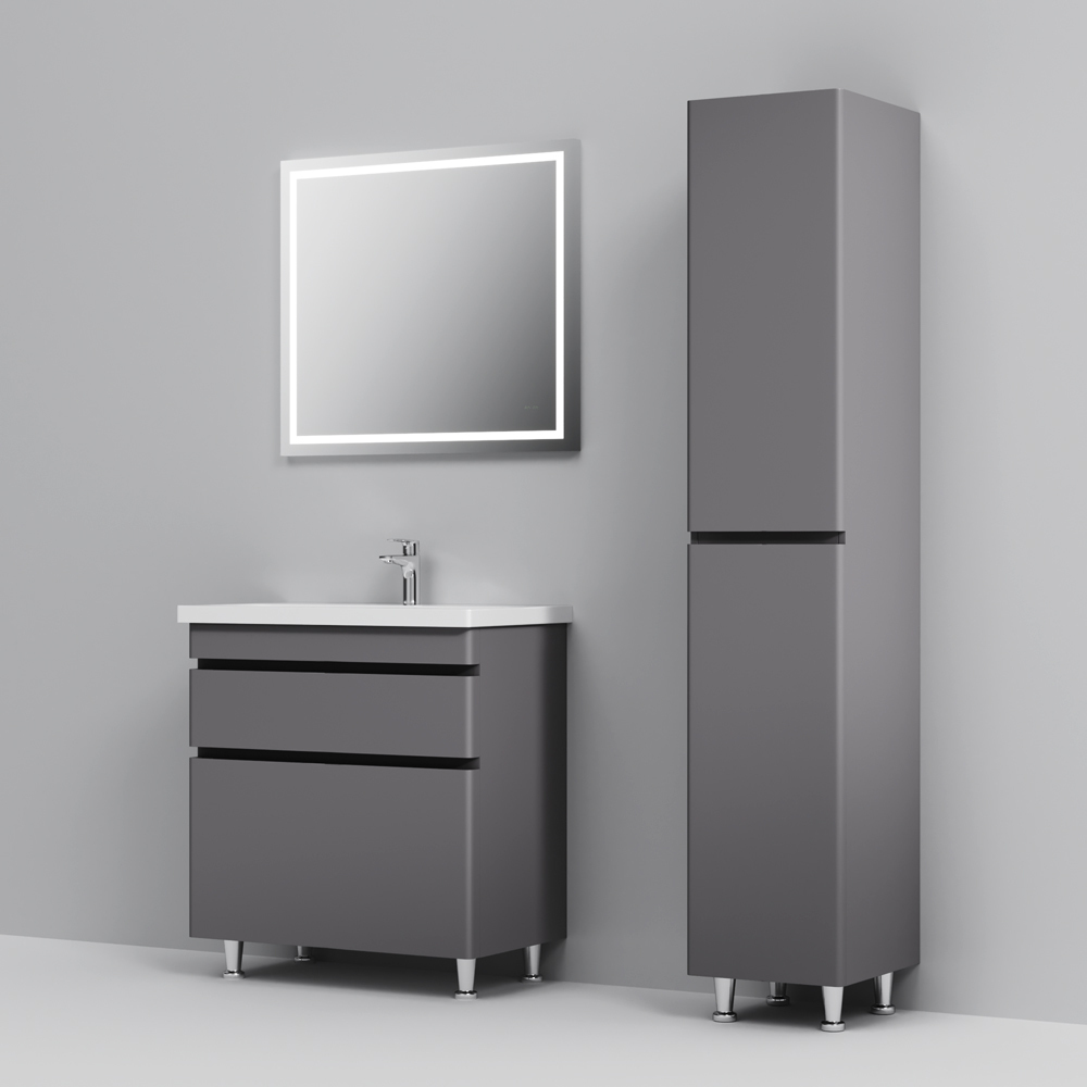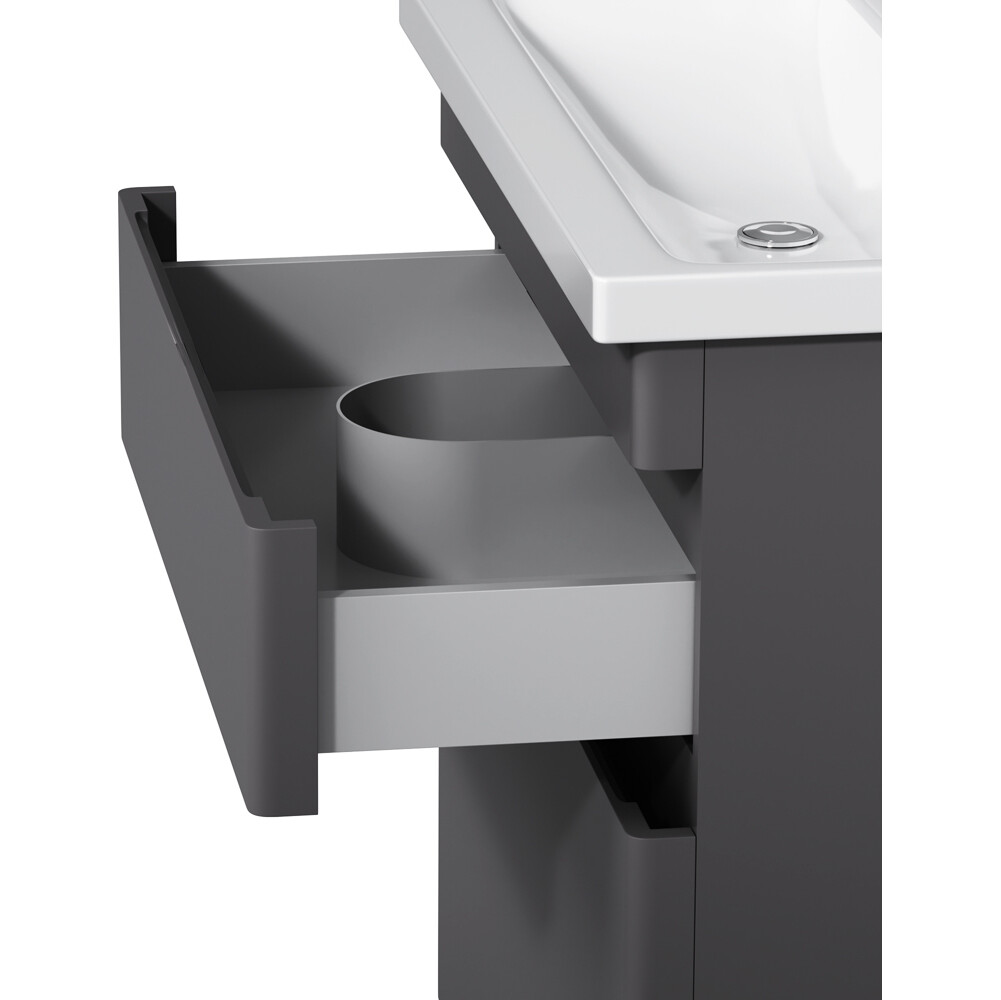Новинка мебели для ванной Hit. Фасады в цвете графит покрыты экологически чистыми и долговечными полиакриловыми эмалями, которые наносятся по специальной технологии покраски в 7 слоев. Это обеспечивает насыщенный цвет в течение всего срока службы (от 10 лет). Мягкое открытие и закрытие ящиков обеспечивают направляющие скрытого монтажа с системой мягкого закрывания soft close. Тумба комплектуется раковиной из стекловидного фарфора, самого гигиеничного и влагостойкого материала. Это самая компактная и функциональная раковина на рынке: проекция всего 42 см при максимальной глубине чаши!