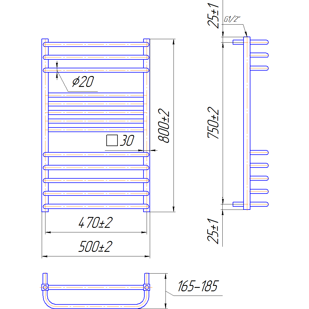 Размеры: высота – 800 мм, ширина – 500 мм, глубина 170 мм, межцентровое расстояние для подключения – 470 мм, диаметр подключения G1/2”.