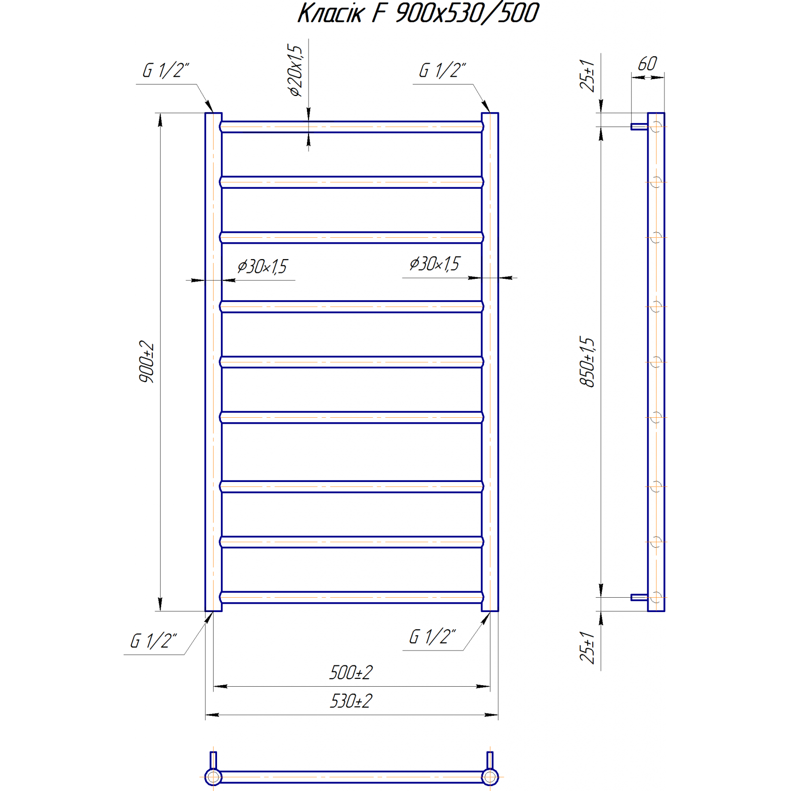 Размеры: высота – 900 мм, ширина – 530 мм, глубина 80 мм, межцентровое расстояние для подключения – 500 мм, диаметр подключения G1/2”.