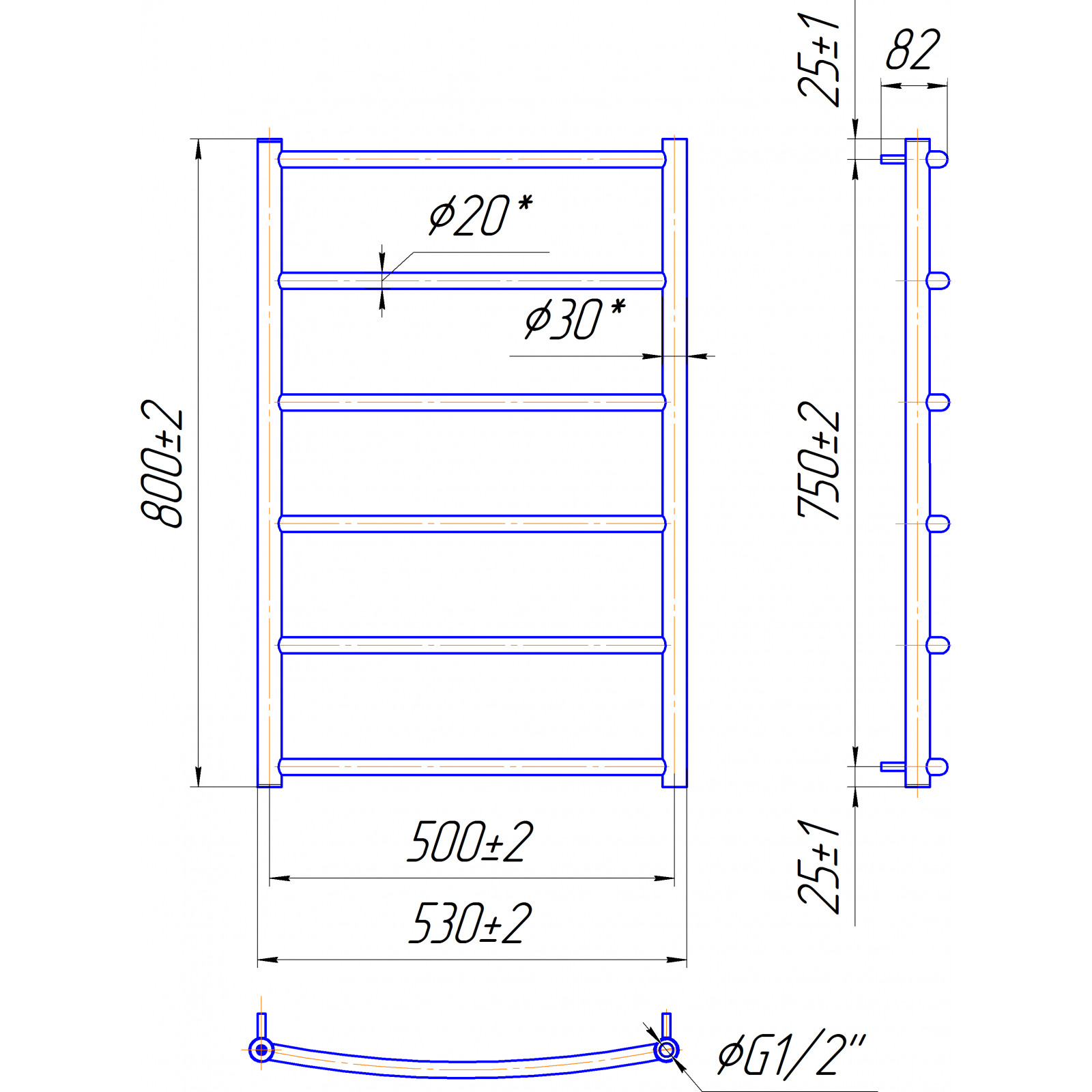 Размеры: высота – 800 мм, ширина – 530 мм, глубина 105 мм, межцентровое расстояние для подключения – 500 мм, диаметр подключения G1/2”.