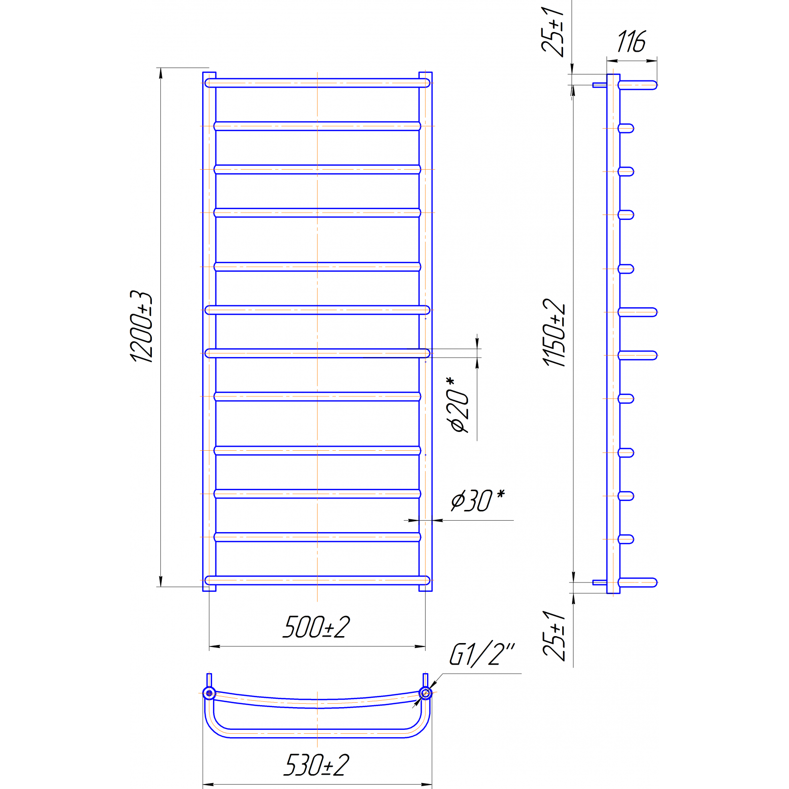 Размеры: высота – 900 мм, ширина – 530 мм, глубина 170 мм, межцентровое расстояние для подключения – 500 мм, диаметр подключения G1/2”.