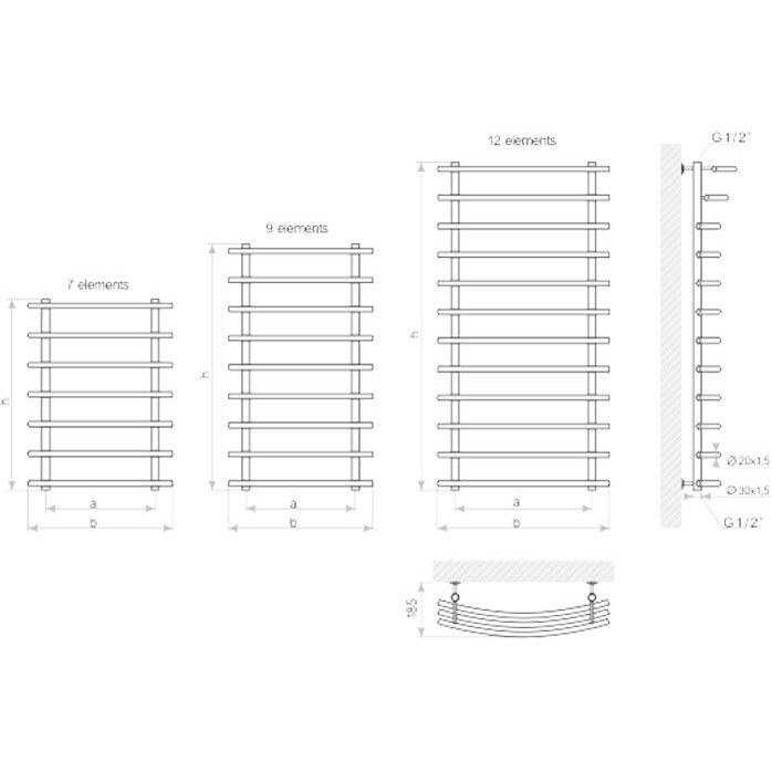 Размеры: высота – 700 мм, ширина – 530 мм, глубина 170 мм, межцентровое расстояние для подключения – 400 мм, диаметр подключения G1/2”.