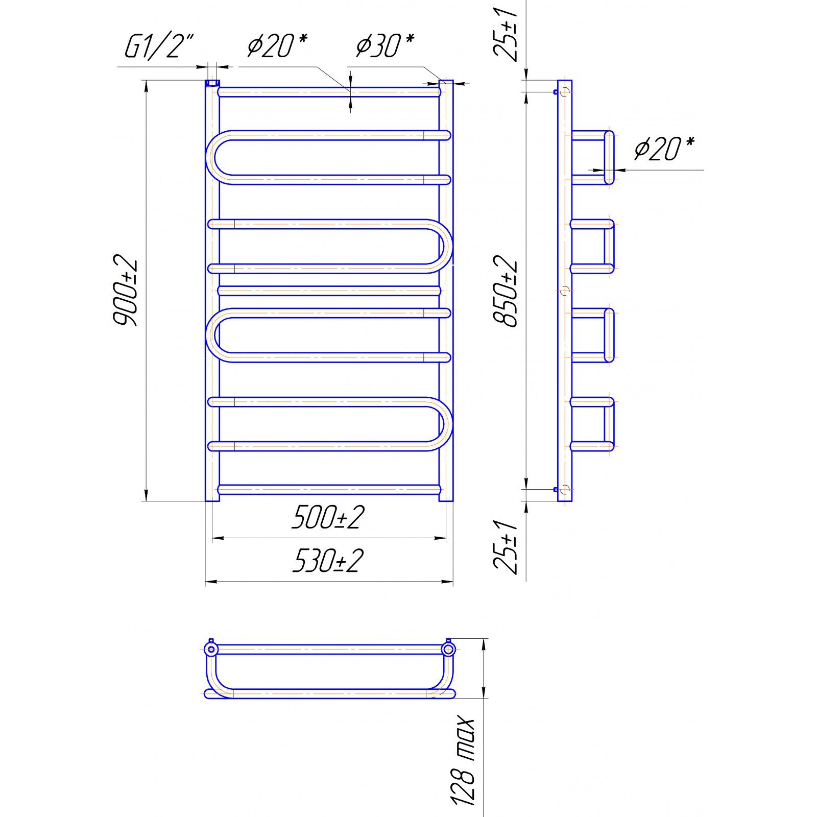 Размеры: высота – 900 мм, ширина – 530 мм, глубина 170 мм, межцентровое расстояние для подключения – 500 мм, диаметр подключения G1/2”.