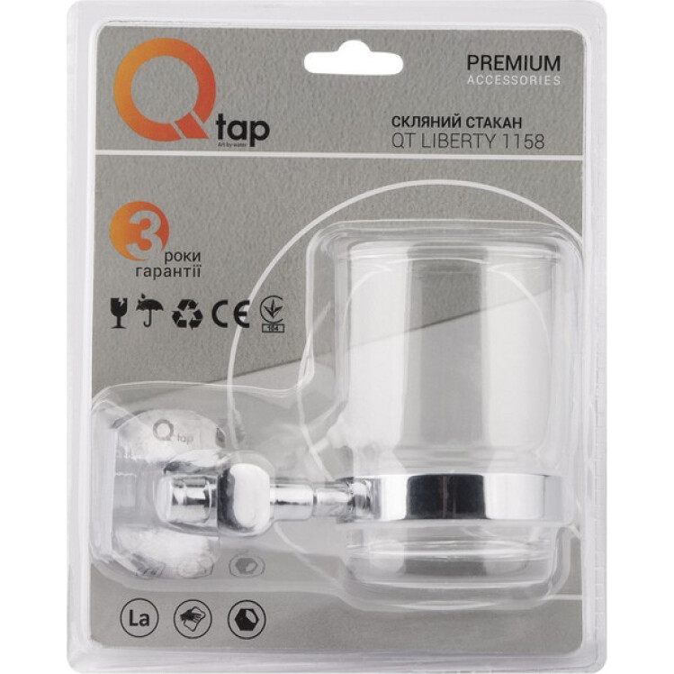 Одинарна склянка Qtap Liberty CRM 1158 знімна, завдяки чому догляд за ним буде простим і легким. Фурнітура склянки прозора. У виробі використовується кільце ущільнювача (прокладка), необхідне для щільного з'єднання металу і скла, також перешкоджають виникненню шуму в результаті зіткнення частин виробу. На утримувач нанесено фірмовий логотип виробника.