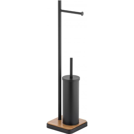 Окрема туалетна щітка із вбудованим тримачем туалетного паперу. Підставка виготовлена із високоякісної сталі, пофарбованої у чорний колір. Основа з натурального бамбукового дерева. Щітка має захисний пластиковий контейнер для запобігання іржі та полегшенню чищення. Нековзна основа забезпечує стійкість стійки.