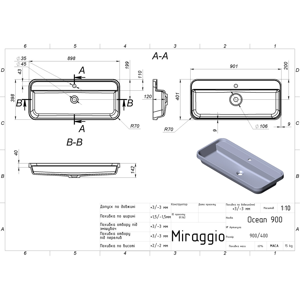 Заводський стандарт моделі OCEAN 900 передбачає отвір під змішувач. Також раковина може бути виготовлена у технологіях MIRAMARBLE та MIRASOFT.