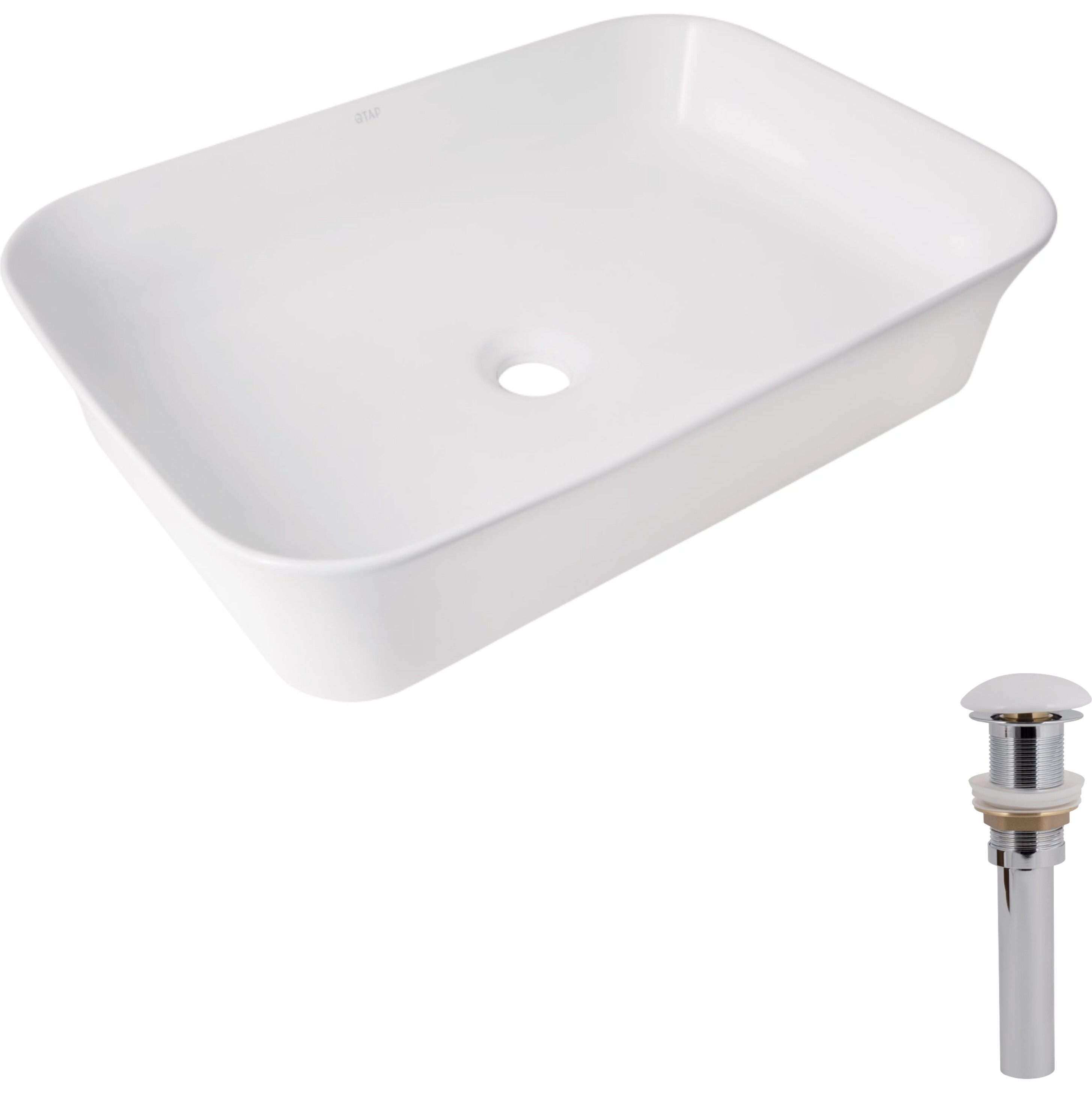 Комплект Qtap Virgo N: Прямокутна накладна раковина підійде для сучасних ванних кімнат. Біла глянсова поверхня підкреслює строгість ліній, а донний клапан Pop-up PU02 забезпечує зручне відкриття та герметичний злив.