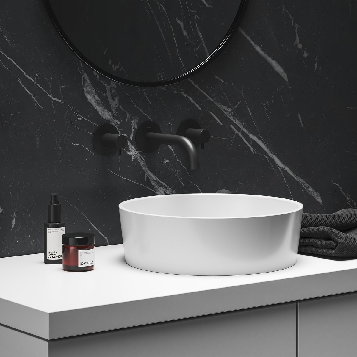 Авторський умивальник виготовлений з литого мармуру, дизайн якого ґрунтується на елементарній геометричній формі кола. Умивальник ідеально збалансує у ванній кімнаті елементи прямокутної форми, такі як плитка душової кабіни чи меблі. Підходить для встановлення на стільницю.
