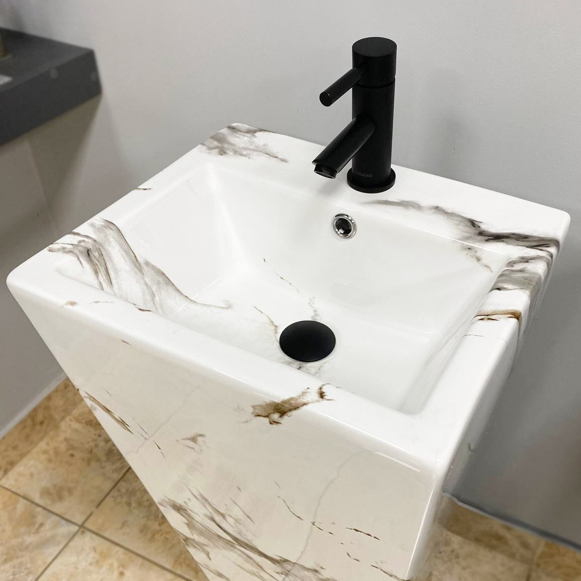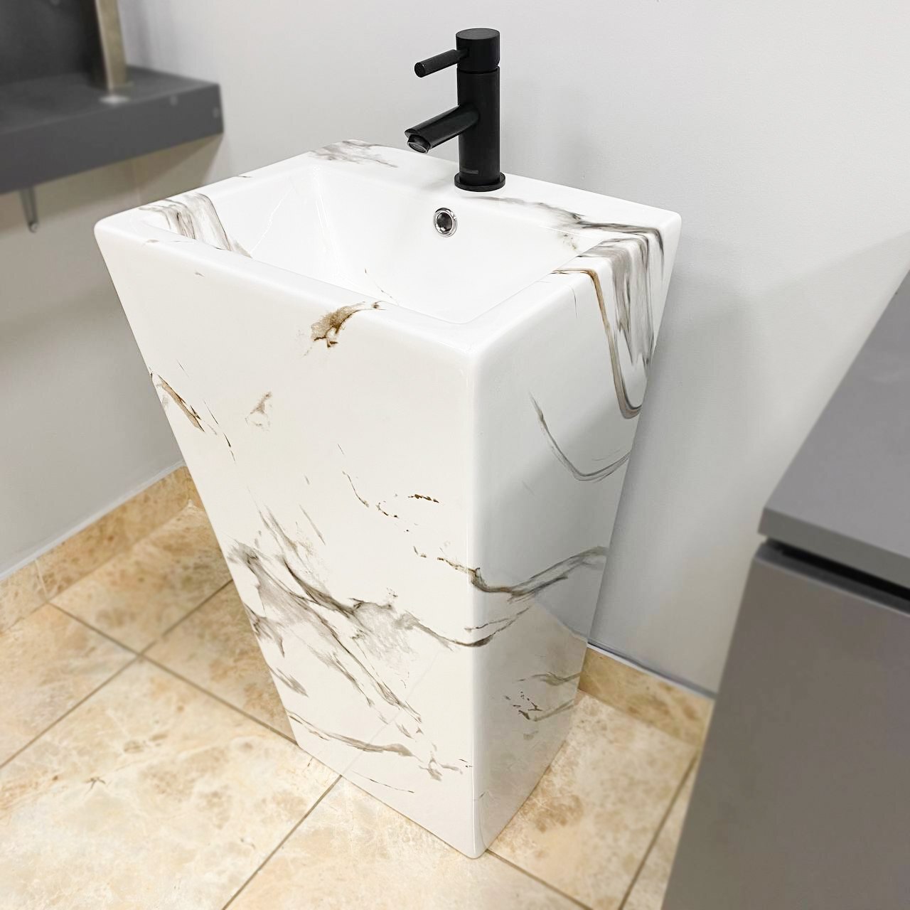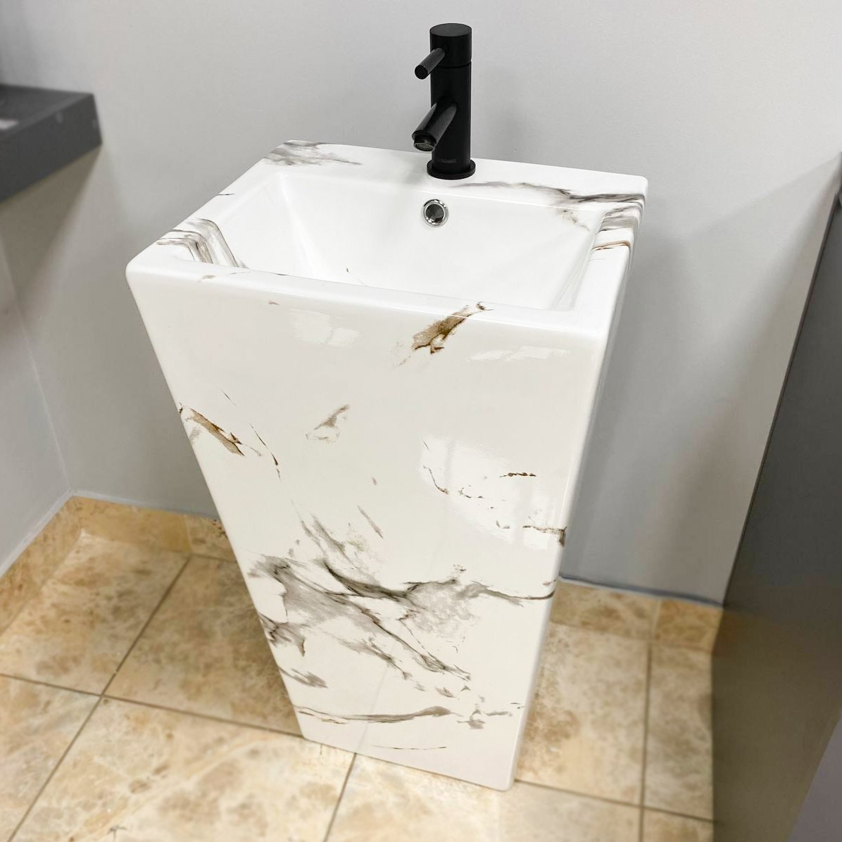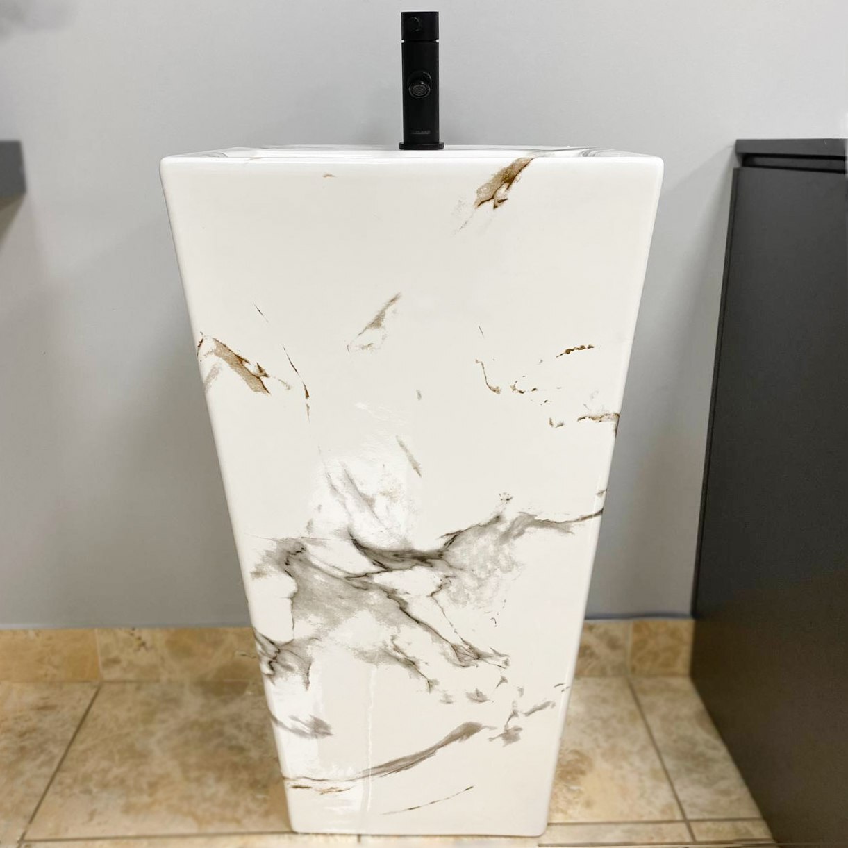 Умивальник для підлоги з простим і елегантним формами, виготовлений з високоякісної кераміки. Ідеально підійде для будь-якої стильної ванної кімнати. У раковині є отвори в задній стінці та в дні, для будь-якого зручного способу підключення до виходу каналізації. Виготовлена з високоякісної кераміки та має унікальний малюнок. Раковина має отвір для змішувача, що дозволяє заощадити дорогоцінний простір у ванній кімнаті.
