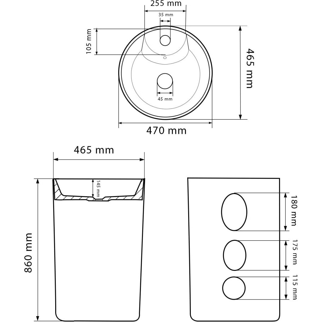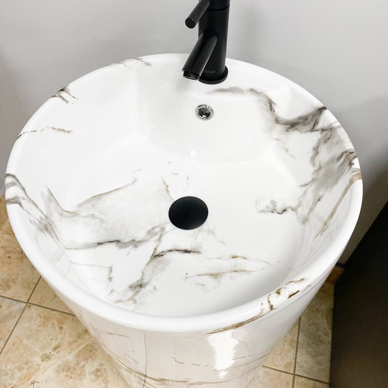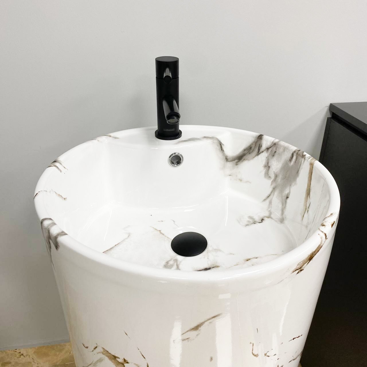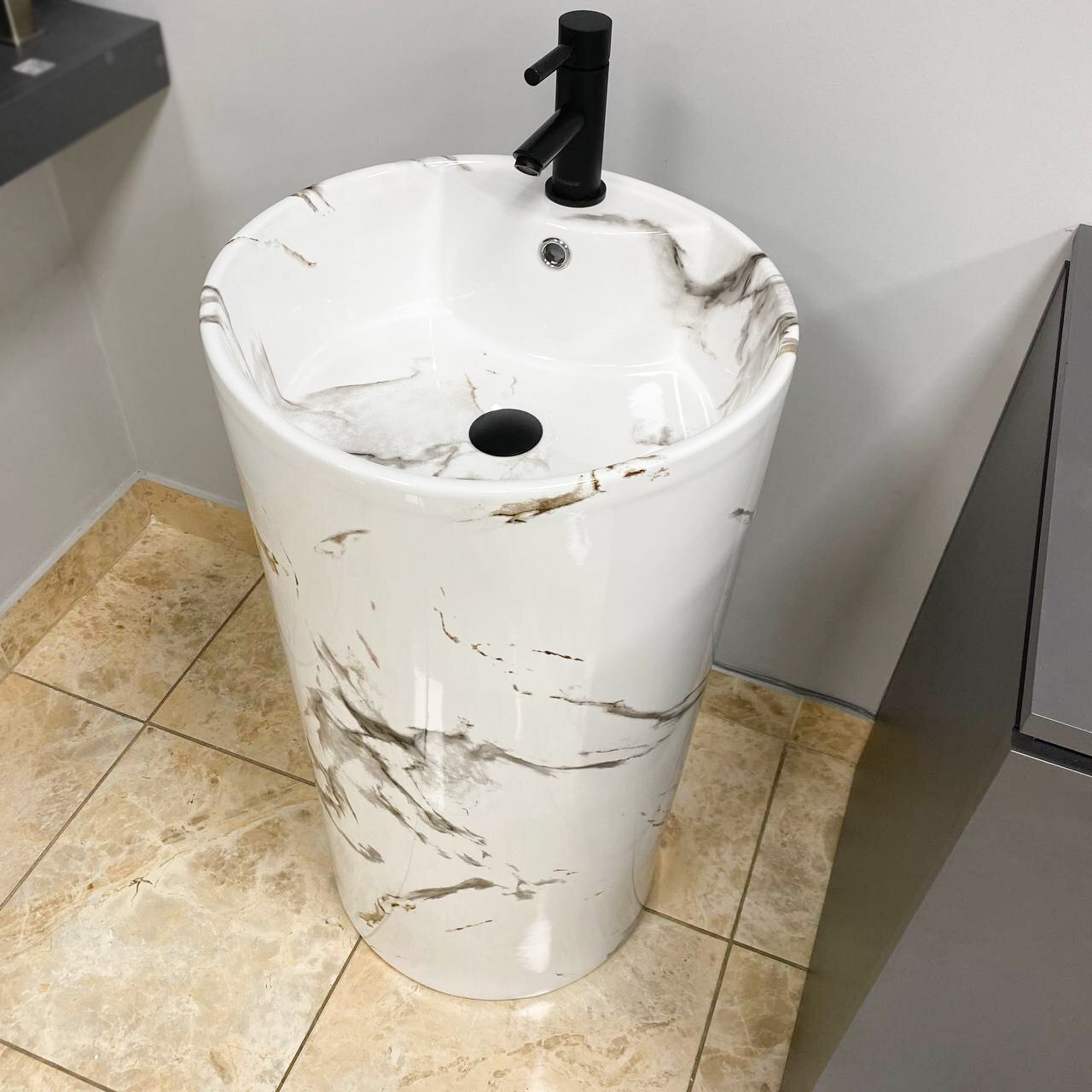 Умивальник для підлоги з простим і елегантним формами, виготовлений з високоякісної кераміки. Ідеально підійде для будь-якої стильної ванної кімнати. У раковині є отвори в задній стінці та в дні, для будь-якого зручного способу підключення до виходу каналізації. Виготовлена з високоякісної кераміки та має унікальний малюнок. Раковина має отвір для змішувача, що дозволяє заощадити дорогоцінний простір у ванній кімнаті.