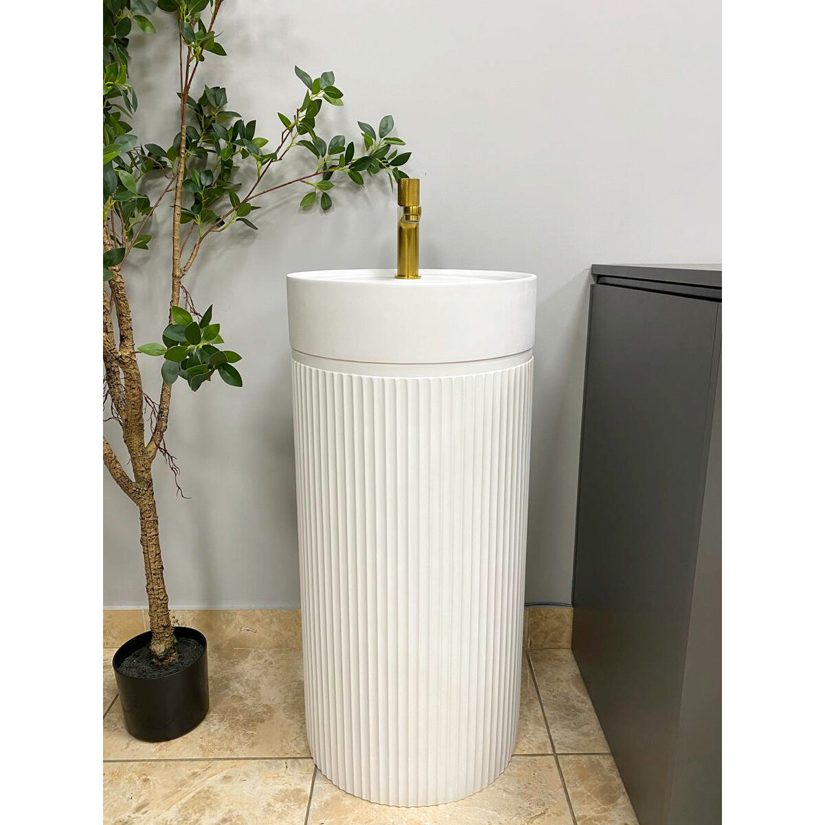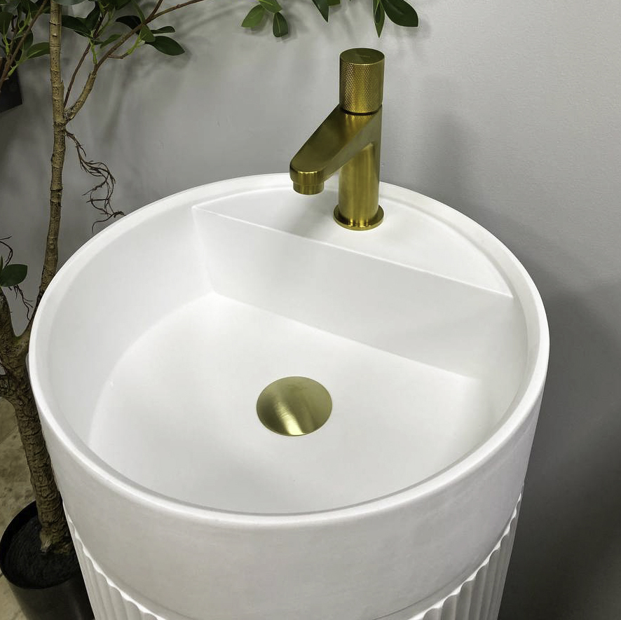 Умивальник для підлоги з простим і елегантним формами, виготовлений з конгломерату. Ідеально підійде для ванної кімнати у будь-якому стилі. У раковині є отвори в задній стінці та в дні, для будь-якого зручного способу підключення до виходу каналізації. Раковина має отвір для змішувача, що дозволяє заощадити дорогоцінний простір у ванній кімнаті.
