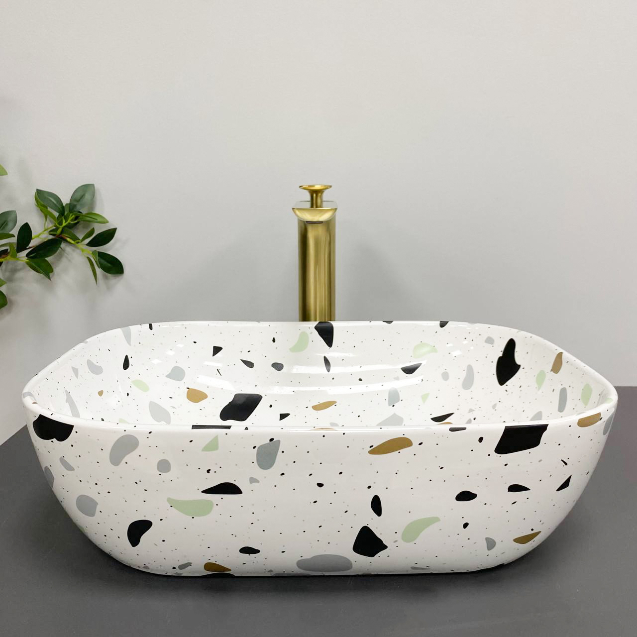 Накладні раковини з колекції VBI RAVENNA мають сучасну прямокутну форму із пом'якшеними заокругленнями. Універсальний дизайн дозволяє підібрати змішувач будь-якої форми. Раковина виготовлена з кераміки найвищої якості, що відрізняється високими гігієнічними властивостями. Модель VBI RAVENNA TEĎZO має унікальний візерунок. В основі є білий колір, прикрашений хаотичними, кольоровими цятками це надає раковині яскравого характеру.
