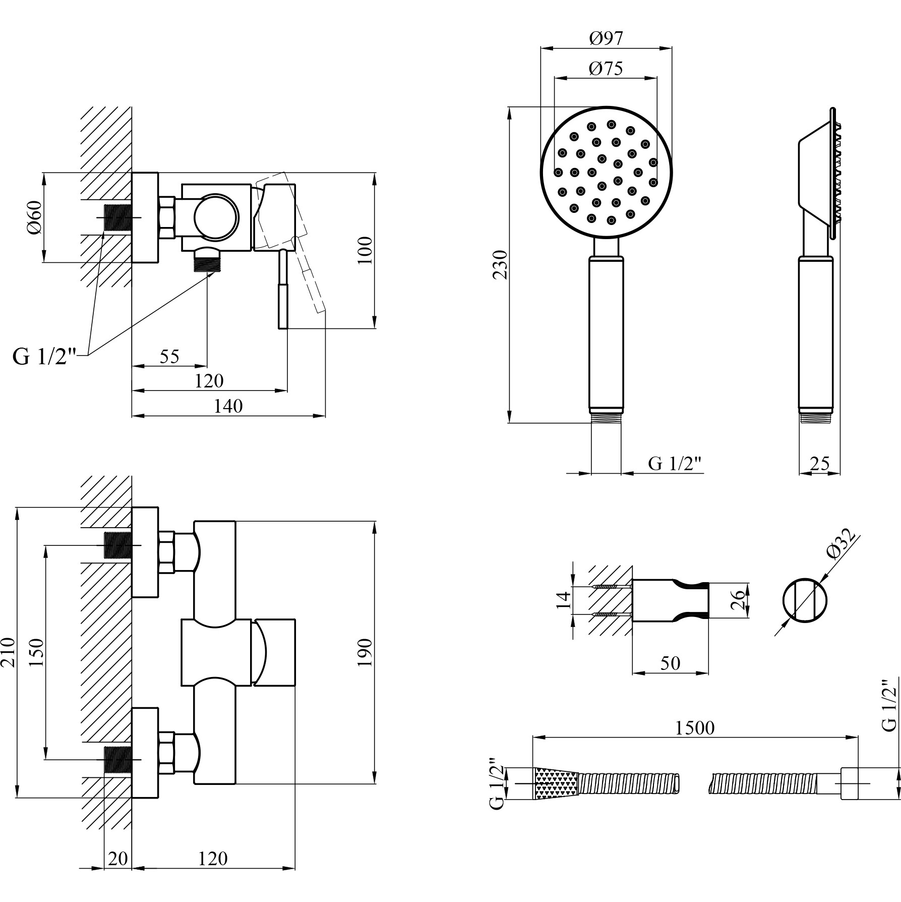 Практичний набір у комплекті: змішувач, душова лійка, шланг, кронштейн та кріплення.