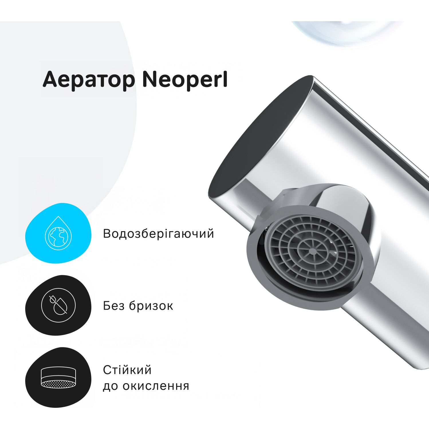 - Аератор Neoperl використовує водозберігаючу технологію, змішуючи водяний потік із повітрям, що запобігає розбризкуванню води