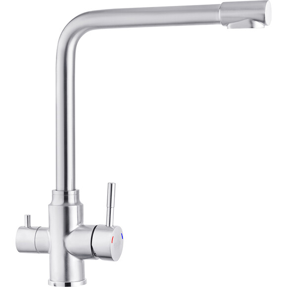 Змішувач для кухні із підключенням до фільтру Kroner KRP Edelstahl Klassisch - ESG038 – ідеальний вибір для вашої кухні. Виготовлений з нержавіючої сталі, гарантує міцність та довговічність. Має привабливий брашированный нікелевий колір, що надає йому елегантності. Змішувач оснащений картриджним механізмом змішування, що дозволяє зручно регулювати температуру води. Його унікальна Г-подібна форма виливу забезпечує зручність при наповненні посуду або миття продуктів. Насолоджуйтесь функціональністю та стилем змішувача Kroner.