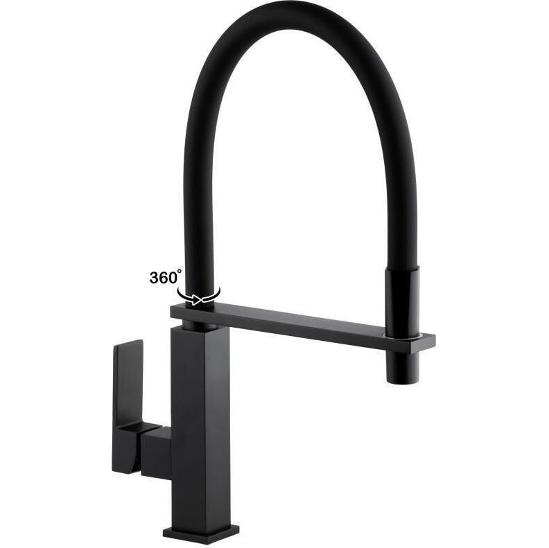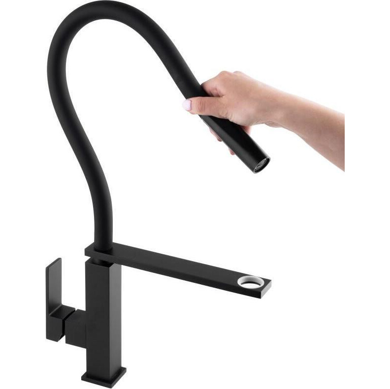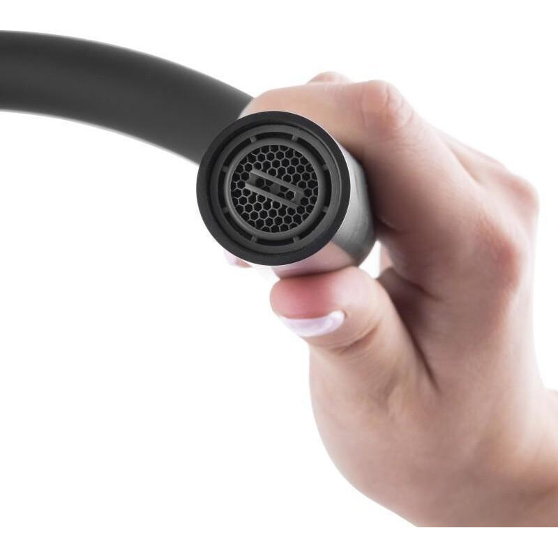 Змішувач для миття механічний одноважільний. Корпус виготовлений з латуні, керамічна головка. Змішувач дуже зручний і практичний у повсякденному використанні - навіть з великим двокамерним миттям. Це стало можливим завдяки гнучкому поворотному виливу з великим радіусом дії. Наконечник носика розташований в отворі із силіконовим покриттям, що гарантує легке та швидке опускання носика, не побоюючись механічних подряпин. Наконечник для аерації – аератор – знижує споживання води до 40%. У комплект входять два плетені шланги (40 см F 3/8") і всі елементи, необхідні для складання. Дизайн змішувача відповідає останнім тенденціям - він виглядає дуже елегантно і ідеально вписується в сучасну кухню.