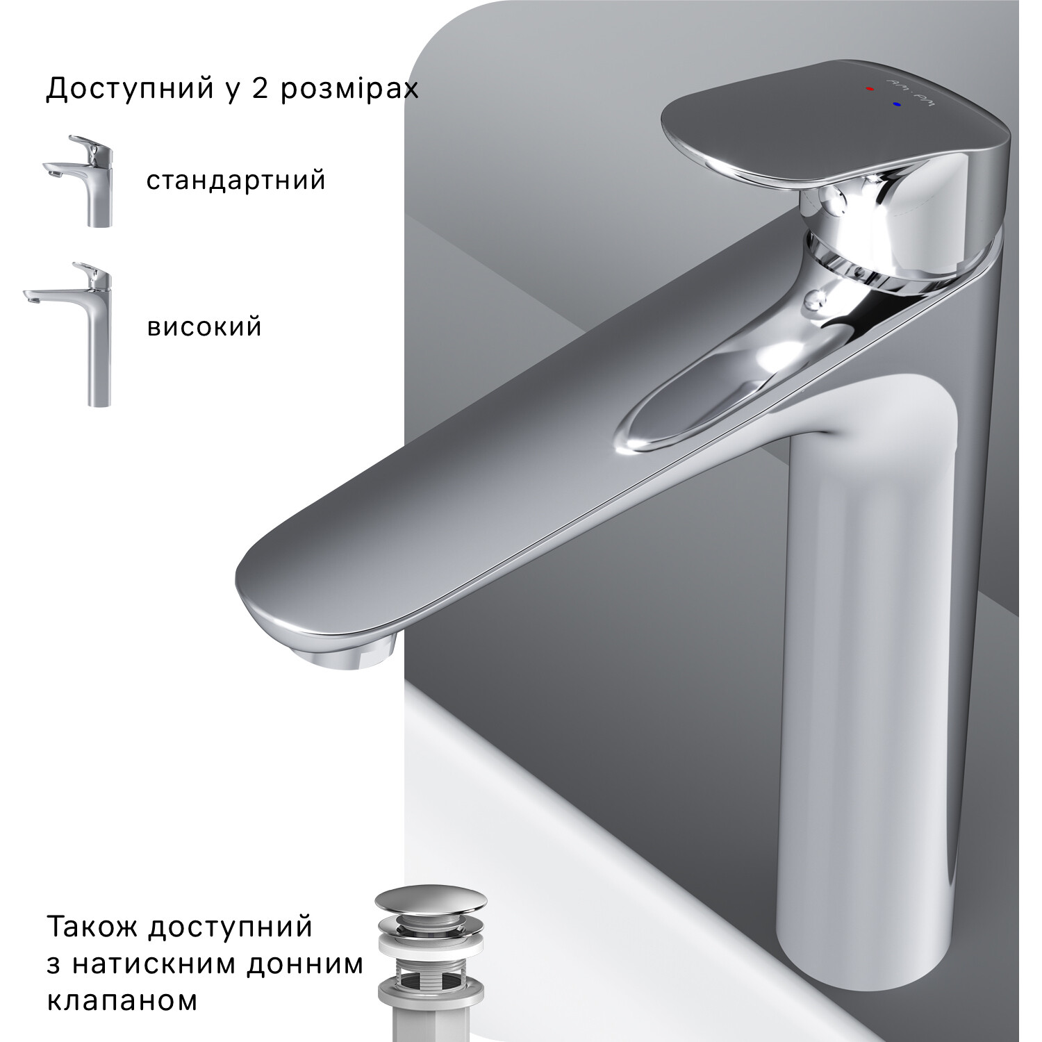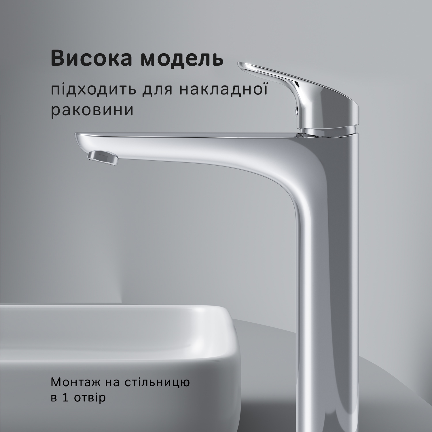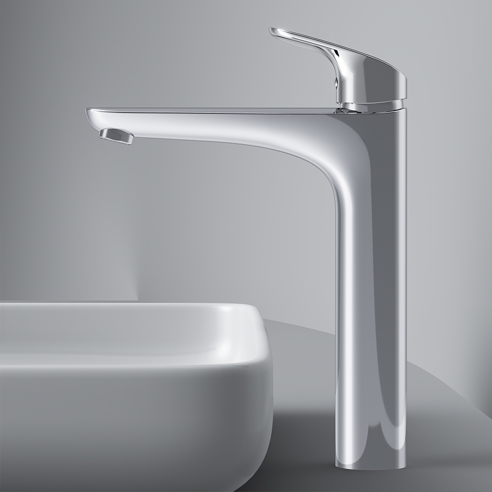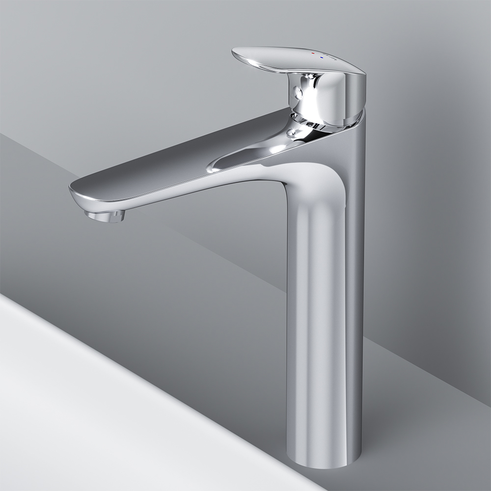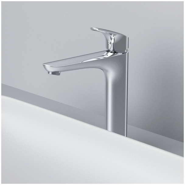 Високий вилив надає змішувачу витонченого вигляду і ідеально підійде для раковини з глибокою чашею, а завдяки великій зоні руху ручки керувати температурою води ще простіше.