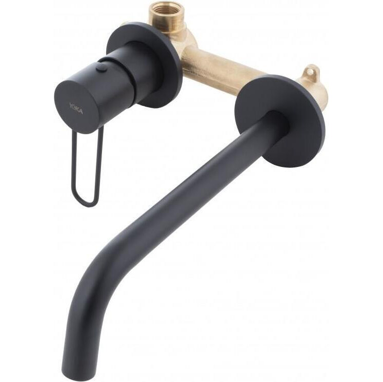Одноважільний механічний змішувач прихованого монтажу з фіксованим виливом та керамічним картриджем. Корпус змішувача виготовлений із латуні. Довгий настінний вилив - робить зручною цю модель змішувача для умивальників різних розмірів.